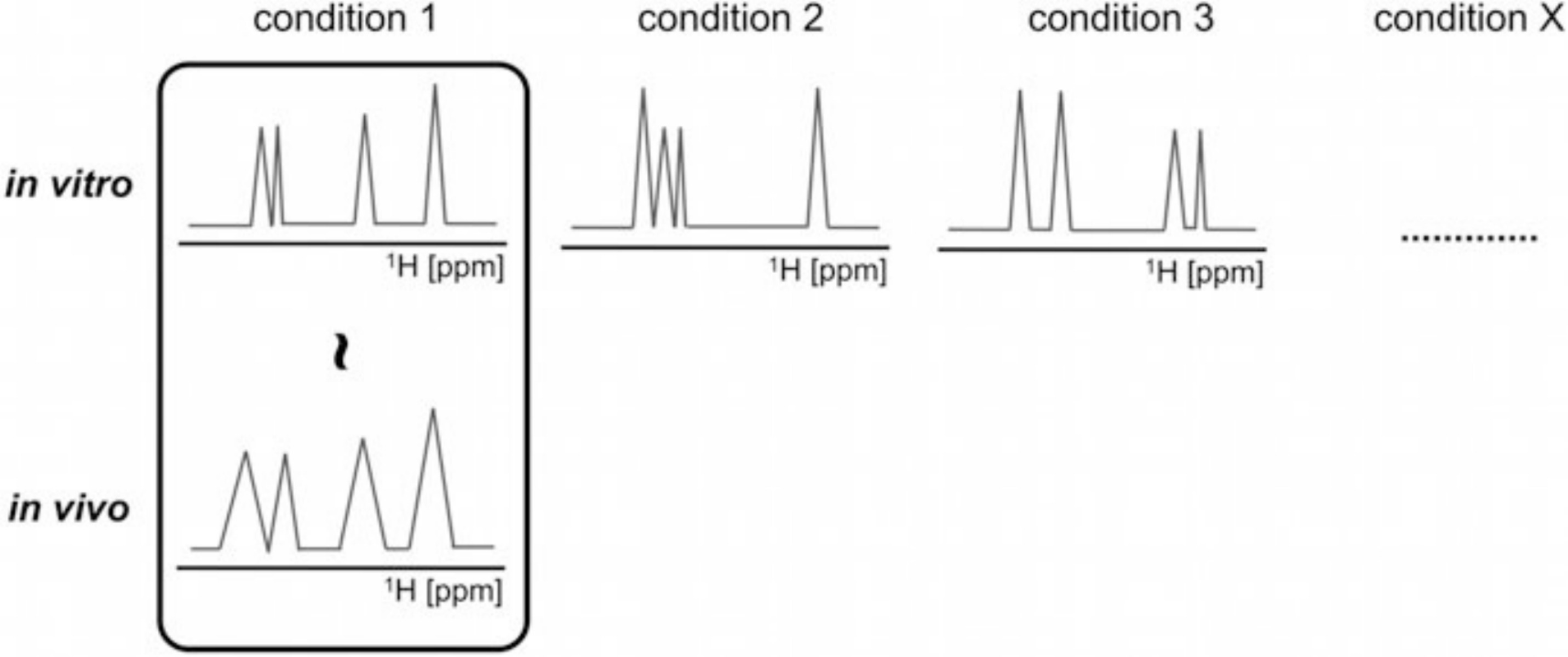 Fig. 5. Schematic outline of interpretational process based on comparison of spectral fingerprints between in-cell and various in vitro conditions. The in vitro conditions are employed to generate different structural arrangements of nucleic acid fragments under study. Environmental factors such as molecular crowding, viscosity, pH, type of counterion, and temperature are typically varied to promote distinct folding topologies in the studied sequence. Each unique fold is associated with a corresponding spectral fingerprint, which is subsequently compared with the spectral fingerprint recorded under physiological conditions in cells. Figure adapted with permission from Hänsel et al. [39]. Copyright 2012 Springer. |