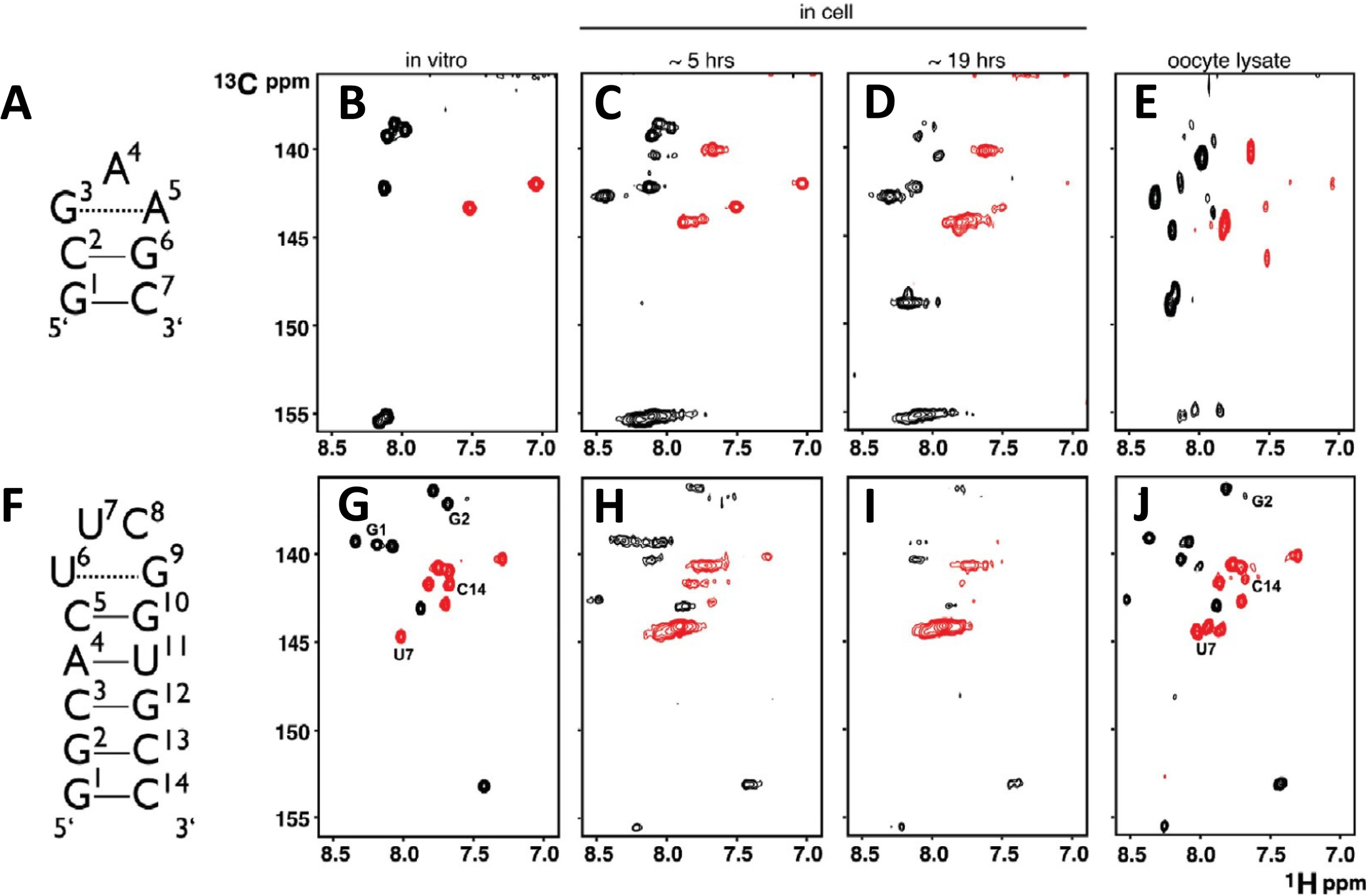 Fig. 7. The designation of the NA target limit available in the time window for in-cell NMR analysis. A) and (F) Schematic representations of secondary structures for d(GCGAAGC) and r(GGCACUUCGGUGCC), respectively. (B) and (G) aromatic regions of the in vitro 2D [1H–13C]-CT-TROSY-HSQC spectra of 13C/15N-labelled d(GCGAAGC) and r(GGCACUUCGGUGCC), respectively. (C) and (D) aromatic regions of the in-cell 2D [1H–13C]-CT-TROSY-HSQC NMR spectra of 13C/15N-labelled d(GCGAAGC) recorded approximately 5 and 19 h after microinjection of the X. laevis oocytes. (H) and (I) Analogous spectra to (C) and (D) for the 13C/15N-labelled r(GGCACUUCGGUGCC). (E) and (J) in vitro spectra of the 13C/15N-labelled d(GCGAAGC) and r(GGCACUUCGGUGCC) in cleared oocyte lysates, prepared by the processing of injected oocytes after in-cell NMR data acquisition. The black (positive) and red (negative) signals correspond to purines and pyrimidines, respectively. The difference in the sign of the purine and the pyrimidine peaks is due to using a constant-time mode of the experiment. Figure adapted with permission from Hänsel et al. [13]. Copyright 2009 American Chemical Society. (For interpretation of the references to colour in this figure legend, the reader is referred to the web version of this article.) |