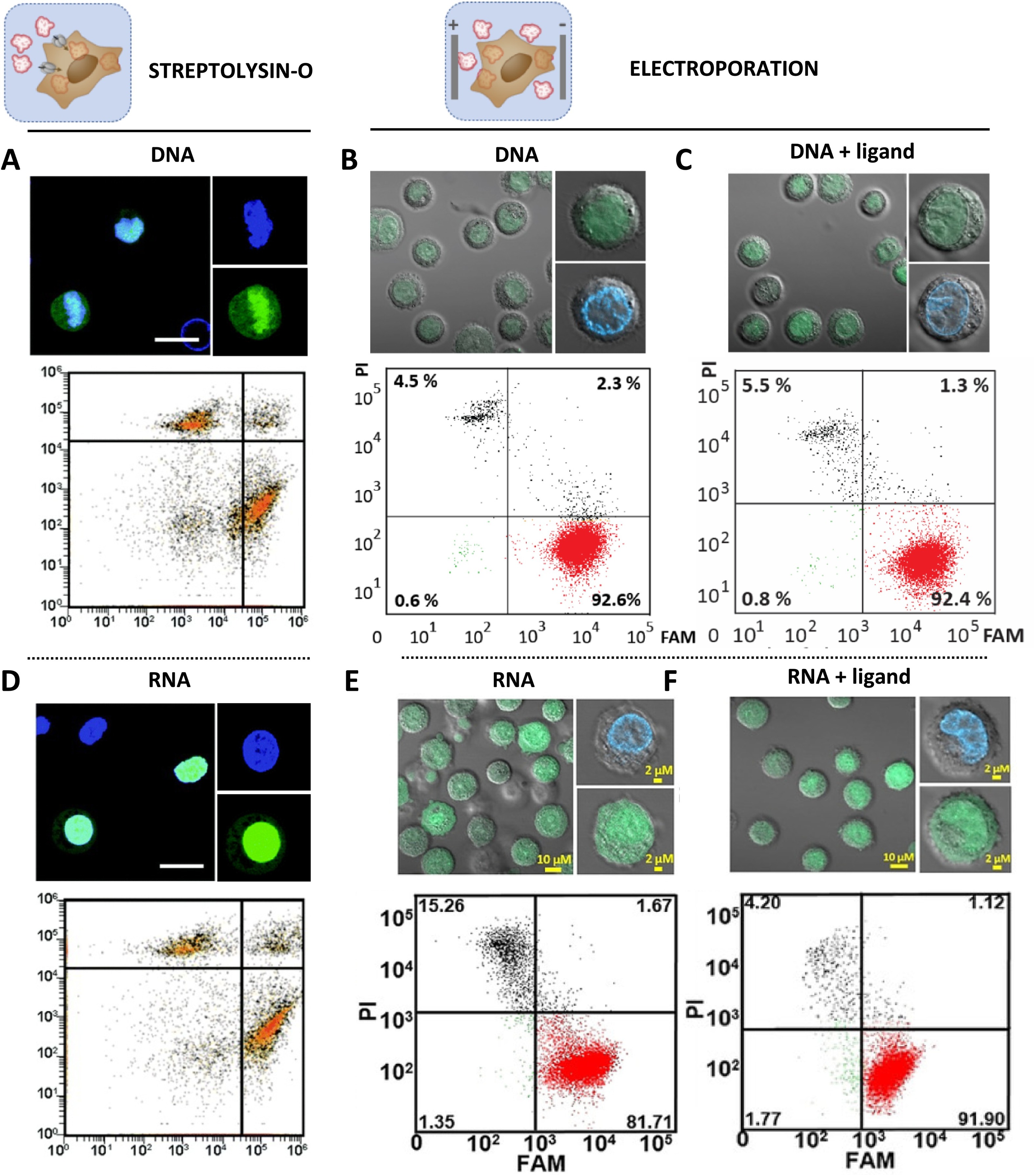 Fig. 14. A comparison of transfection efficiencies, viabilities, and localizations of DNA and RNA targets delivered to HeLa cells using pore-forming toxin (Streptolysin-O) and electroporation. The confocal microscopy images report on NA target localizations; green and blue colors indicate the localization of FAM-labelled NA and Hoechst-stained nuclear DNA, respectively. FCM plots below the corresponding confocal microscopy images show the distribution of the FAM signal intensity in the transfected cells and cell viability (PI). For an interpretation of the FCM plot, see Fig. 15. The data in (A) and (D) were obtained using (dG*C*GAAGC) (* marks position of the phosphorothioate modification) and fully O′-methylated r(GGCACUUCGGUGCC), respectively. The figs. (A) and (D) were adapted with permission from [77]. Copyright 2019 Royal Society of Chemistry. The data in (B), (C), (D), and (E) were obtained using d(CGTCGTAGTGC)2, a double-stranded T-T mismatch containing 10 base-pair DNA fragment in complex with low molecular weight ligand (2,7-BisNP-NH), r(GGCACUUCGGUGCC), and 72 nt RNA aptamer, respectively. The figs. (B) and (C) were adapted with permission from [19]. Copyright 2019 from Krafcikova et al. under the terms of a CC-BY-NC-ND license. The figs. (E) and (F) were adapted with permission from [22]. Copyright 2021 from Broft et al. under the terms of a CC BY 4.0 license. (For interpretation of the references to colour in this figure legend, the reader is referred to the web version of this article.) |