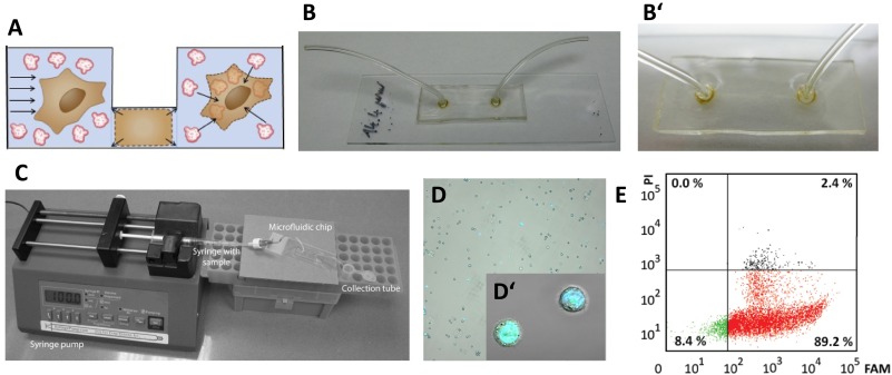 Fig. 15. Illustration of using a microfluidic-based approach exploiting volume exchange for convective transfer (VECT) to deliver 12 base-pair DNA target into HeLa cells. (A) Schematic representation of the VECT principle. (B) Microfluidic chip (expansion shown in B′); courtesy of Prof. Todd Sulchek and Dr. S. Chen (Georgia Institute of Technology, USA). (C) Instrumental setup used for VECT-based transfection. (D) and (E) confocal images and FCM plot of the transfected cells. Green and blue colors in (D) indicate the localization of FAM-labelled DNA fragment and Hoechst-stained nuclear DNA. The viability of transfected cells and transfection efficiency were determined by double-staining (DNA-PI/DNA-FAM). For an interpretation of the FCM plot, see Fig. 15. The data in (D) and (F) were acquired by J. Rynes and V. Zlinska, co-authors of this review. (For interpretation of the references to colour in this figure legend, the reader is referred to the web version of this article.) |