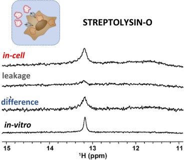 Fig. 21. An illustrative example of the post-processing of in-cell NMR data to account for the leakage of a NA target from the intracellular space to the surrounding medium during in-cell NMR data acquisition. The spectrum of the medium surrounding the cells in the in-cell NMR sample, referred to as the “leakage” control, is mathematically subtracted from the in-cell NMR spectrum. The resulting difference spectrum is subject to interpretation. The figure was adapted with permission from [77]. Copyright 2019 Royal Society of Chemistry. |