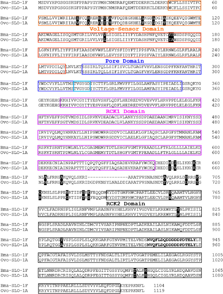 Fig 1. Amino acid sequence alignment of Bma-SLO-1F and Ovo-SLO-1A.The voltage sensor domain (VSD; orange boxes), pore domain (PD; blue boxes) comprising the selectivity filter (light blue box) and two C-terminal domains for regulator of K+ conductance (RCK1; pink boxes and RCK2; black boxes) are indicated. Amino acids which are not identical between filarial species are highlighted by a black background. Gaps are indicated by “_” symbols for amino acid residues that are missing. |