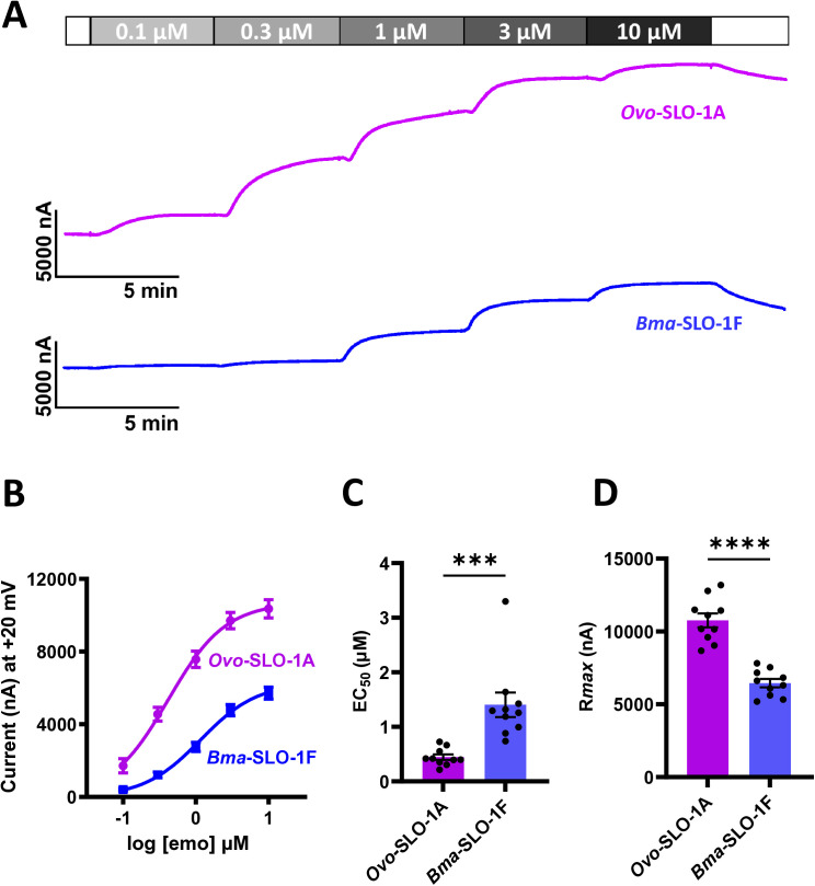 Fig 2. Emodepside (emo) concentration response relationships for Ovo-SLO-1A and Bma-SLO-1F.A. Representative traces for two-electrode voltage-clamp recording showing outward currents for Ovo-SLO-1A (top; pink trace) and Bma-SLO-1F (lower; blue trace) channels, elicited in the presence of increasing concentrations of emodepside (0.1 to 10 µM) at a holding potential of +20 mV. B. Emodepside concentration-response relationships for Ovo-SLO-1A (pink) and Bma-SLO-1F. C. Emodepside EC50 analysis (mean ± S.E.M) for Ovo-SLO-1A and Bma-SLO-1F channels. D: Maximum current responses (Rmax) (mean ± S.E.M) of emodepside for Ovo-SLO-1A and Bma-SLO-1F channels. Bottom was constrained to zero for curve fitting. Emodepside concentration-response curves were generated using n = 10 oocytes for Ovo-SLO-1 A and n = 10 oocytes for Bma-SLO-1F, pooled from three independent batches of oocytes to generate 10 biological replicates. EC50 and Rmax values were also prepared using the concentration response curve analysis. ***P < 0.001, ****P < 0.0001 significantly different as indicated; unpaired two-tailed student t-test. |