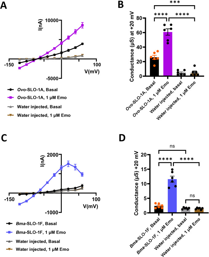 Fig 3. Effects of emodepside on current-voltage curves (IVCs) of the Ovo-SLO-1A and Bma-SLO-1F channels expressed in Xenopus laevis oocytes.A. Basal currents (mean ± S.E.M) from oocytes expressing Ovo-SLO-1A (n = 6 biological replicates, black) or injected with water (n = 6 biological replicates, grey) in the absence of emodepside. Currents (mean ± S.E.M) obtained from oocytes expressing Ovo-SLO-1A (n = 6 biological replicates, pink) or injected with water (n = 6 biological replicates, red) in the presence of 1 µM emodepside. B. Slope conductance analysis (mean ± S.E.M) of Ovo-SLO-1A expressing oocytes perfused with recording solution and no drug (n = 6 biological replicates; black), Ovo-SLO-1A expressing oocytes exposed to 1 µM emo (n = 6 biological replicates; pink), water injected oocytes perfused with recording solution and no drug (grey; n = 6 biological replicates) and water injected oocytes exposed to 1 µM emodepside (red; n = 6 biological replicates). C. Basal currents (mean ± S.E.M) from oocytes expressing Bma-SLO-1F (n = 6 biological replicates, black) or injected with water (n = 6 biological replicates, grey) in the absence of emodepside. Currents (mean ± S.E.M) obtained from oocytes expressing Bma-SLO-1F (n = 6 biological, blue) or injected with water (n = 6 biological replicates, tan) in the presence of 1 µM emodepside. D. Slope conductance analysis (mean ± S.E.M) of Bma-SLO-1F expressing oocytes perfused with recording solution and no drug (n = 6 biological replicates; black), Bma-SLO-1F expressing oocytes exposed to 1 µM emo (n = 6 biological replicates; pink), water injected oocytes perfused with recording solution and no drug (grey; n = 6 biological replicates) and water injected oocytes exposed to 1 µM emodepside (red; n = 6 biological replicates). Biological replicates were pooled from two independent studies for water injected, Bma-SLO-1F and Ovo-SLO-1A injected oocytes. |