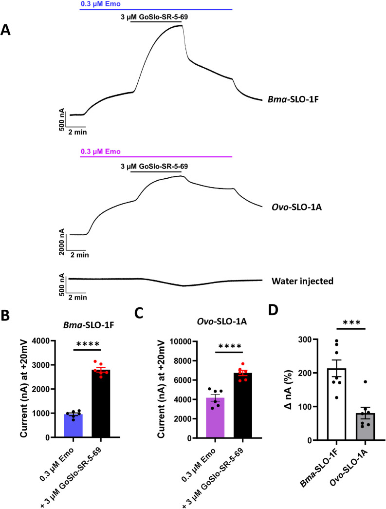 Fig 5. Effects of GoSlo-SR-5-69 on Bma-SLO-1F and Ovo-SLO-1A-mediated emodepside responses.A. Representative traces for Bma-SLO-1F, Ovo-SLO-1A and water injected oocytes perfused with 0.3 µM emodepside, followed by 3 µM GoSlo-SR-5-69 in the continued presence of emodepside and an initial wash with 0.3 µM emodepside with a final wash with oocyte recording solution. B. Mean current responses (in nA) generated in response to 0.3 µM emodepside alone and in combination with 3 µM GoSlo-SR-5-69 for oocytes expressing the Bma-SLO-1F channel. Blue bar: 0.3 µM emodepside alone (n = 6 biological replicates, pooled from two independent experiments). Black bar: 3 µM GoSlo-SR-5-69 co-applied with 0.3 µM emodepside (n = 6 biological replicates, pooled from two independent experiments). C. Mean current responses (in nA) generated in response to 0.3 µM emodepside alone and in combination with 3 µM GoSlo-SR-5-69 for oocytes expressing the Ovo-SLO-1A channel. Pink bar: 0.3 µM emodepside alone (n = 6 biological replicates, pooled from two independent experiments). Black bar: 3 µM GoSlo-SR-5-69 in combination with 0.3 µM emodepside (n = 6 biological replicates, pooled from two independent experiments). D. Percentage (%) increase analyses of currents produced by emodepside and GoSlo-SR-5-69 co-application for Bma-SLO-1F (white, n = 6) and Ovo-SLO-1A (grey, n = 6). Data are plotted as mean ± S.E.M; ****P < 0.0001 significantly different as indicated; paired two-tailed student t-test; **P < 0.001, significantly different as indicated, unpaired two-tailed student t-test. |