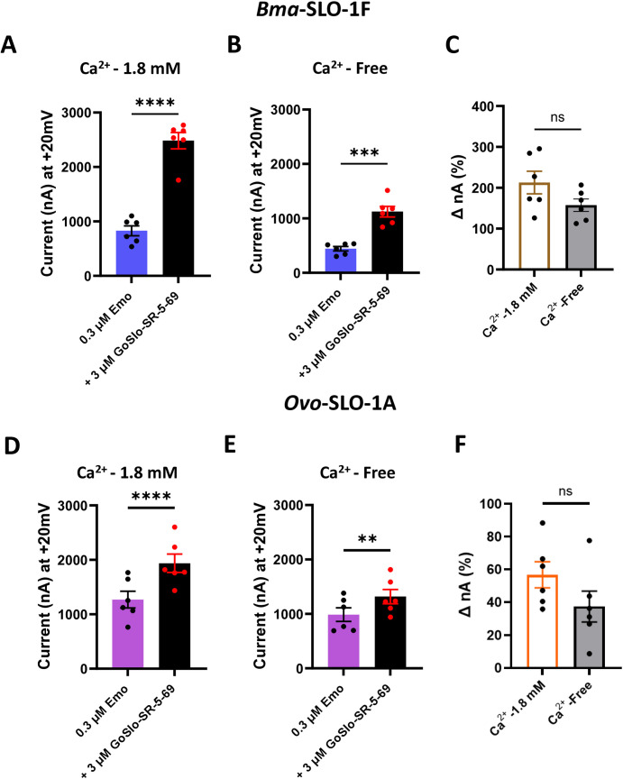 Fig 6. Effects of extracellular Ca2+ on GoSlo-SR-5-69 potentiation of Bma-SLO-1F and Ovo-SLO-1A-mediated emodepside responses.A. Peak current (in nA) amplitudes produced by Bma-SLO-1F expressing oocytes in response to 0.3 µM emodepside alone and in combination with 3 µM GoSlo-SR-5-69 in the presence of normal recording solution consisting of 1.8 mM added Ca2+. Blue bar: 0.3 µM emodepside alone; Black bar: 3 µM GoSlo-SR-5-69 co-applied with 0.3 µM emodepside (n = 6 biological replicates, pooled from three independent experiments). ****P < 0.0001 significantly different as indicated; paired two-tailed student t-test B. Peak current (in nA) amplitudes produced by oocytes expressing the Bma-SLO-1F channel in response to 0.3 µM emodepside alone and in combination with 3 µM GoSlo-SR-5-69 in the absence of 1.8 mM added Ca2+. Blue bar: 0.3 µM emodepside alone; Black bar: 3 µM GoSlo-SR-5-69 co-applied with 0.3 µM emodepside (n = 6 biological replicates, pooled from three independent experiments). ***P < 0.001, significantly different as indicated, paired two-tailed student t-test. C. Percentage (%) increase in currents produced by emodepside and GoSlo-SR-5-69 co-application for Bma-SLO-1F expressing oocytes perfused with normal recording solution, containing 1.8 mM added Ca2+ (White bar with brown border, n = 6), or modified recording solution lacking added Ca2+(grey bar with black border, n = 6). P > 0.05, no statistical significance (ns) as indicated, unpaired two-tailed student t-test. D. Peak current (in nA) amplitudes produced by oocytes expressing the Ovo-SLO-1A channel in response to 0.3 µM emodepside alone and in combination with 3 µM GoSlo-SR-5-69 in the presence of 1.8 mM added Ca2+. Pink bar: 0.3 µM emodepside alone; Black bar: 3 µM GoSlo-SR-5-69 co-applied with 0.3 µM emodepside (n = 6 biological replicates, pooled from three independent experiments). E. Peak current (in nA) amplitudes produced by Ovo-SLO-1A expressing oocytes in response to 0.3 µM emodepside alone and in combination with 3 µM GoSlo-SR-5-69 in the absence of 1.8 mM added Ca2+. Pink bar: 0.3 µM emodepside alone; Black bar: 3 µM GoSlo-SR-5-69 co-applied with 0.3 µM emodepside (n = 6 biological replicates, pooled from three independent experiments). **P < 0.0001 significantly different as indicated; paired two-tailed student t-test; ***P < 0.01, significantly different as indicated, paired two-tailed student t-test. F. Percentage (%) increase in currents produced by emodepside and GoSlo-SR-5-69 co-application for Ovo-SLO-1A expressing oocytes in the presence of 1.8 mM added Ca2+ (White bar with orange border, n = 6), or modified recording solution lacking added Ca2+(Grey bar with black border, n = 6). P > 0.05, no statistical significance (ns) as indicated, unpaired two-tailed student t-test. |