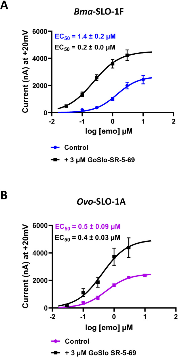 Fig 7. Effects of GoSlo-SR-5-69 as a positive allosteric modulator on Bma-SLO-1F and Ovo-SLO-1A channels on emodepside mediated response.A. Concentration-response plots for emodepside alone, (blue) and emodepside in the presence of 3 µM GoSlo-SR-5-69 (black) for the Bma-SLO-1F channel, (n = 6 biological replicates, pooled from three independent experiments). B. Emodepside concentration-response plots for Ovo-SLO-1A in the presence of emodepside alone, pink) and emodepside in the presence of 3 µM GoSlo-SR-5-69 (black), (n = 6 biological replicates, pooled from three independent experiments). Bottom was constrained to zero for curve fitting. |