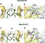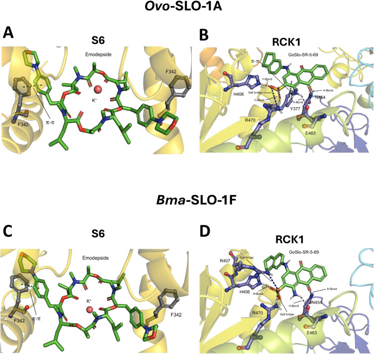 Fig 8. Identified poses of emodepside and GoSlo-SR-5-69 in Ovo-SLO-1A and Bma-SLO-1F channels.A. Emodepside bound at the S6 pocket for Ovo-SLO-1A channel. B. GoSlo-SR-5-69 bound at the RCK1 pocket for Ovo-SLO-1A channel. C. Emodepside bound at the S6 pocket for Bma-SLO-1F channel D. GoSlo-SR-5-69 bound at the RCK1 pocket for Bma-SLO-1F channel. For both channels, emodepside is bound below the selectivity filter, indicating the π-π stacking between F342 and emodepside. Displayed are also the stabilizing ligand-receptor interactions between GoSlo-SR-5-69 and the respective filarial nematode splice variant channels. |