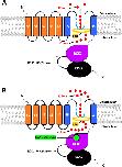 Fig 9. Summary diagram of the putative mechanism of GoSlo-SR-5-69 alone and in combination with emodepside on Bma-SLO-1F and Ovo-SLO-1A channels.A. Emodepside (gold ring) binds within the pore domain (PD) beneath the selectivity filter (light blue inverted block arc) and directly activates either Bma-SLO-1F or Ovo-SLO-1A channels resulting in the translocation of K+ ions (red circles) out of the cell (outward current). B. Activation of Bma-SLO-1F or Ovo-SLO-1A by emodepside (gold ring) in the PD. GoSlo-SR-5-69 (green octagon) then binds to a putative allosteric site (RCK1 domain) of the channel giving rise to stabilization of the channel gating ring in the open state. Subsequently, K+ permeation and translocation are further increased leading to greater current amplitude and the potentiation of emodepside response. The removal of GoSlo-SR-5-69 results in ion translocation almost back to normal levels previously seen in the presence of emodepside binding alone. |