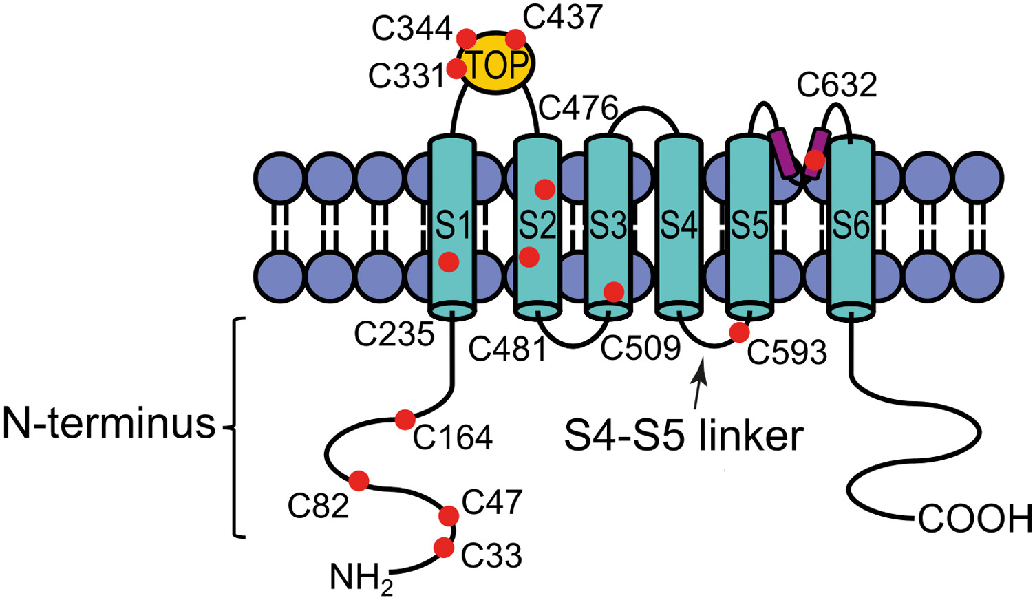 Figure 1 Topology of PC2 subunit in the lipid bilayer. Localization of cysteine residues in different PC2 domains is highlighted with red dots. S1-S6: transmembrane domains 1-6.