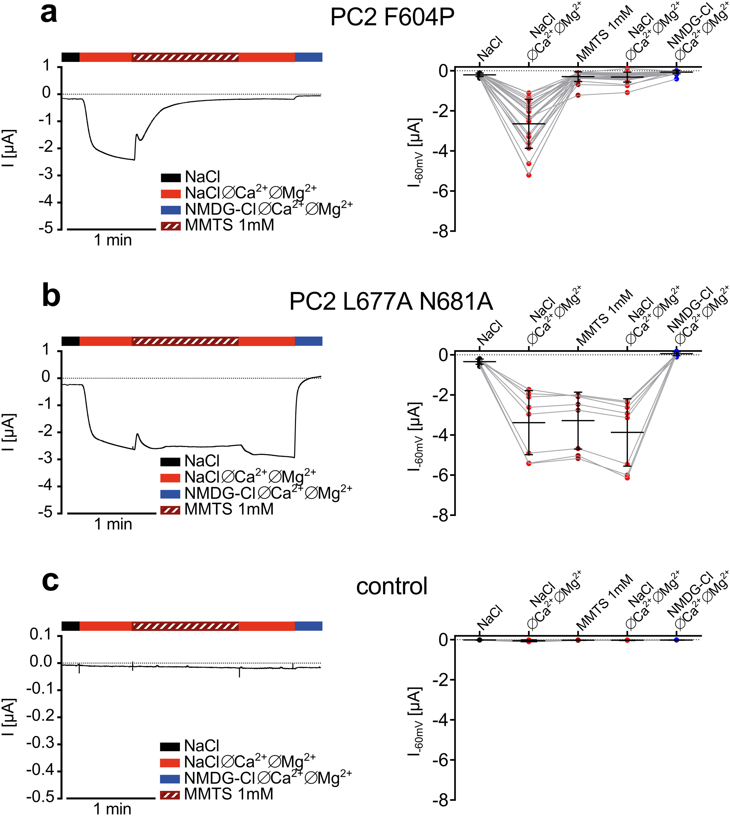Figure 2. MMTS acutely inhibits PC2 F604P but not PC2 L677A N681A.Left panels: representative whole-cell current traces obtained from an oocyte expressing PC2 F604P (A) or PC2 L677A N681A (B) or from a control oocyte (C) clamped at −60 mV. Different bath solutions were applied as indicated by bars. MMTS (1 mM) was applied in a NaCl ØCa2+ØMg2+ bath solution. Note that the brief transient initial inhibition of PC2 mediated currents in response to MMTS exposure is probably an artifact caused by the solution exchange and minor contamination of the superfusing solution with divalent cations. Right panels: summary data from similar experiments as shown in the corresponding left panels. Inward current values reached in each extracellular solution as indicated are shown. Mean ± SD and individual data points are shown (a: N = 3, n = 26; b: N = 1, n = 8; c: N = 2, n = 6; N indicates the number of different batches of Xenopus laevis oocytes, and n indicates the number of individual oocytes analyzed per experimental group). Lines connect data points obtained from the same oocyte. Dotted line indicates zero current level. PC2, polycystin-2; MMTS, methyl methanethiosulfonate. |