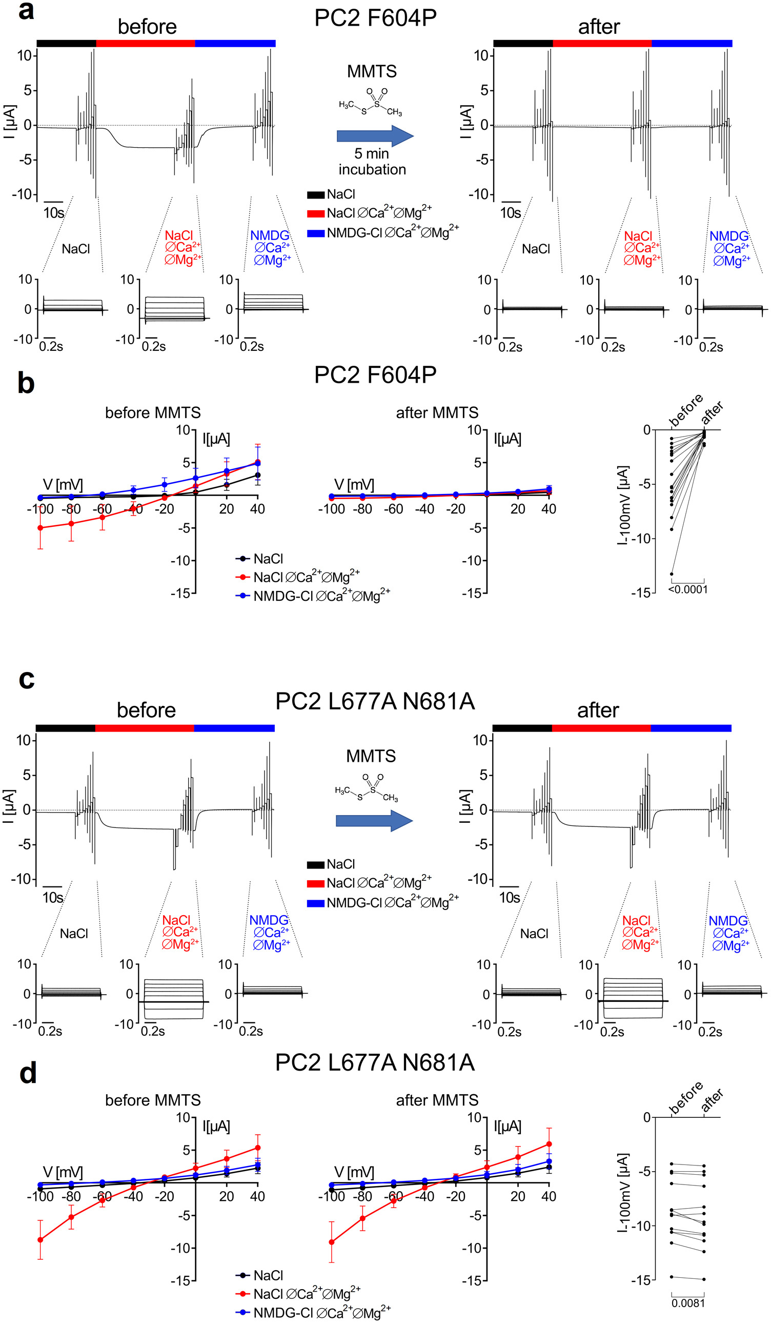 Figure 3 PC2 F604P but not PC2 L677A N681A was strongly and irreversibly inhibited by incubation with MMTS (1 mM) a, c Representative whole-cell current traces obtained in an oocyte expressing PC2 F604P (a) or PC2 L677A N681A (c) before (left panels) and after (right panels) 5 min incubation in ND9 solution supplemented with MMTS (1 mM). Application of different bath solutions during the current measurement is indicated by bars. For each condition, a voltage step protocol was performed with consecutive 1,000 ms voltage steps in 20 mV increments starting with a hyperpolarizing pulse to −100 mV from a holding potential of −60 mV. Overlays of the corresponding whole-cell current traces are shown below the traces for each bath solution. The oocyte was not clamped during the incubation with MMTS. Before the second current measurement, MMTS was washed out with NaCl bath solution. Impaling microelectrodes were not removed from the oocyte until the end of the experiment. b, d left and middle panels Average I/V plots (mean ± SD) were constructed from similar experiments as shown in a and c using the mean current values measured during the last 300 ms of the voltage pulses. Data points represent average values from 13-18 oocytes (b: N=5 n=18; d: N=4 n=13; N indicates the number of different batches of Xenopus laevis oocytes, and n indicates the number of individual oocytes analyzed per experimental group). Right panels Summary data from the same experiments shown in left and middle panels demonstrate maximal inward current values reached during application of hyperpolarizing pulses of −100 mV in NaCl ØCa2+ØMg2+ solution before and after MMTS application. Lines connect data points obtained from the same oocyte. P-values are calculated using Wilcoxon matched-pairs signed rank test.
