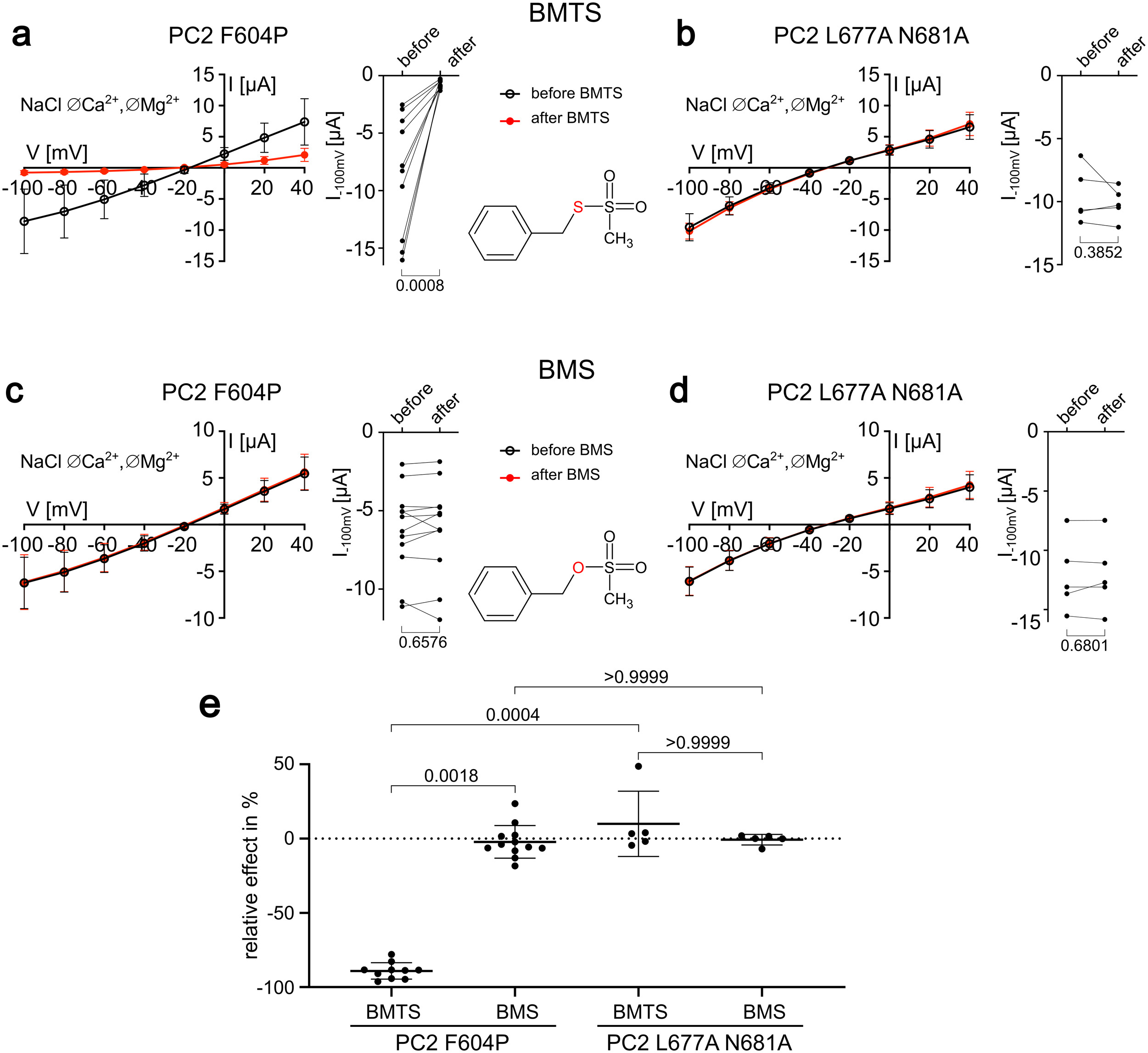Figure 5 The inhibitory effect of BMTS on PC2 F604P was abolished when its cysteine-reactive MTS group was replaced by an MS group. a-d Whole-cell currents in oocytes expressing PC2 F604P (a, c) or PC2 L677A N681A (b, d) were detected before and after 5 min incubation with BMTS (1 mM; a, b) or BMS (1 mM; c, d). Experiments were performed as described in Figure 3. Left panels Average I/V plots (mean ± SD) obtained in NaCl ØCa2+ØMg2+ solution before and after incubation with BMTS or BMS as indicated. Right panels Summary data from the experiments shown in the corresponding left panels depict maximal inward current values reached at −100 mV before and after incubation with the respective reagent. Lines connect data points obtained from the same oocyte. P-values were calculated using paired two-tailed Student’s t-test. e, Relative effect of BMTS or BMS on currents at -100 mV in % was calculated as described in Figure 4c using the current values shown in a-d. P-values were calculated using Kruskal-Wallis and Dunn’s multiple comparisons test (N=2, n=5-12; N indicates the number of different batches of Xenopus laevis oocytes, and n indicates the number of individual oocytes analyzed per experimental group). |