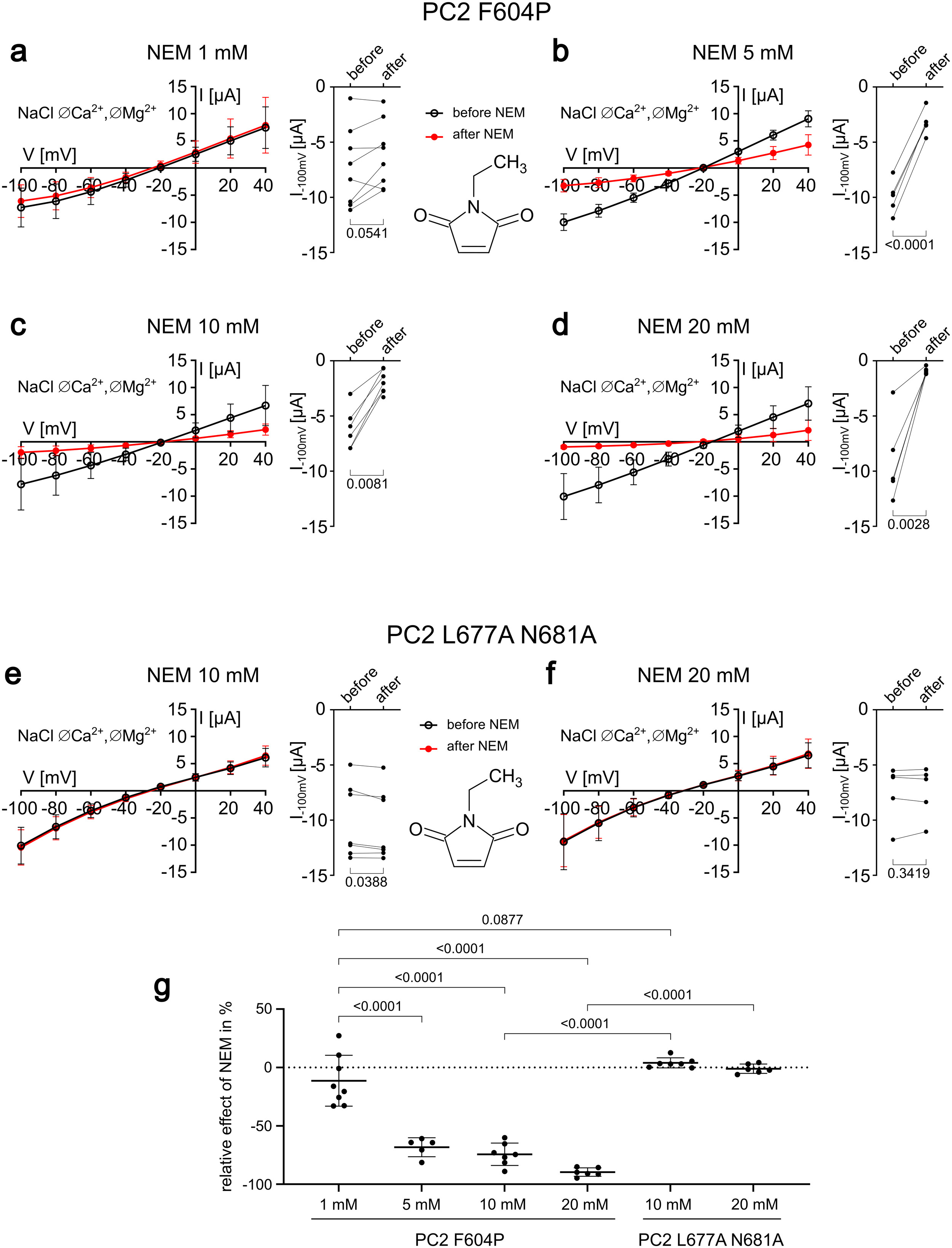 Figure 6 The cysteine-reactive reagent NEM inhibited PC2 F604P but not PC2 L677A N681A. a-f Whole-cell currents in oocytes expressing PC2 F604P (a-d) or PC2 L677A N681A (e, f) were detected before and after 5 min incubation with NEM at the indicated concentrations. Experiments were performed as described in Figure 3. Left panels Average I/V plots (mean ± SD) obtained in NaCl ØCa2+ØMg2+ solution before and after incubation with NEM. Right panels Summary data from the experiments shown in the corresponding left panels depict maximal inward current values reached at −100 mV before and after incubation with NEM. Lines connect data points obtained from the same oocyte. P-values were calculated using paired two-tailed Student’s t-test. e, Relative effect of NEM on currents at -100 mV in % was calculated as described in Figure 4c using the current values shown in a-f. P-values were calculated using one-way ANOVA and Šídák's multiple comparisons test (N=2, n=5-8; N indicates the number of different batches of Xenopus laevis oocytes, and n indicates the number of individual oocytes analyzed per experimental group). |