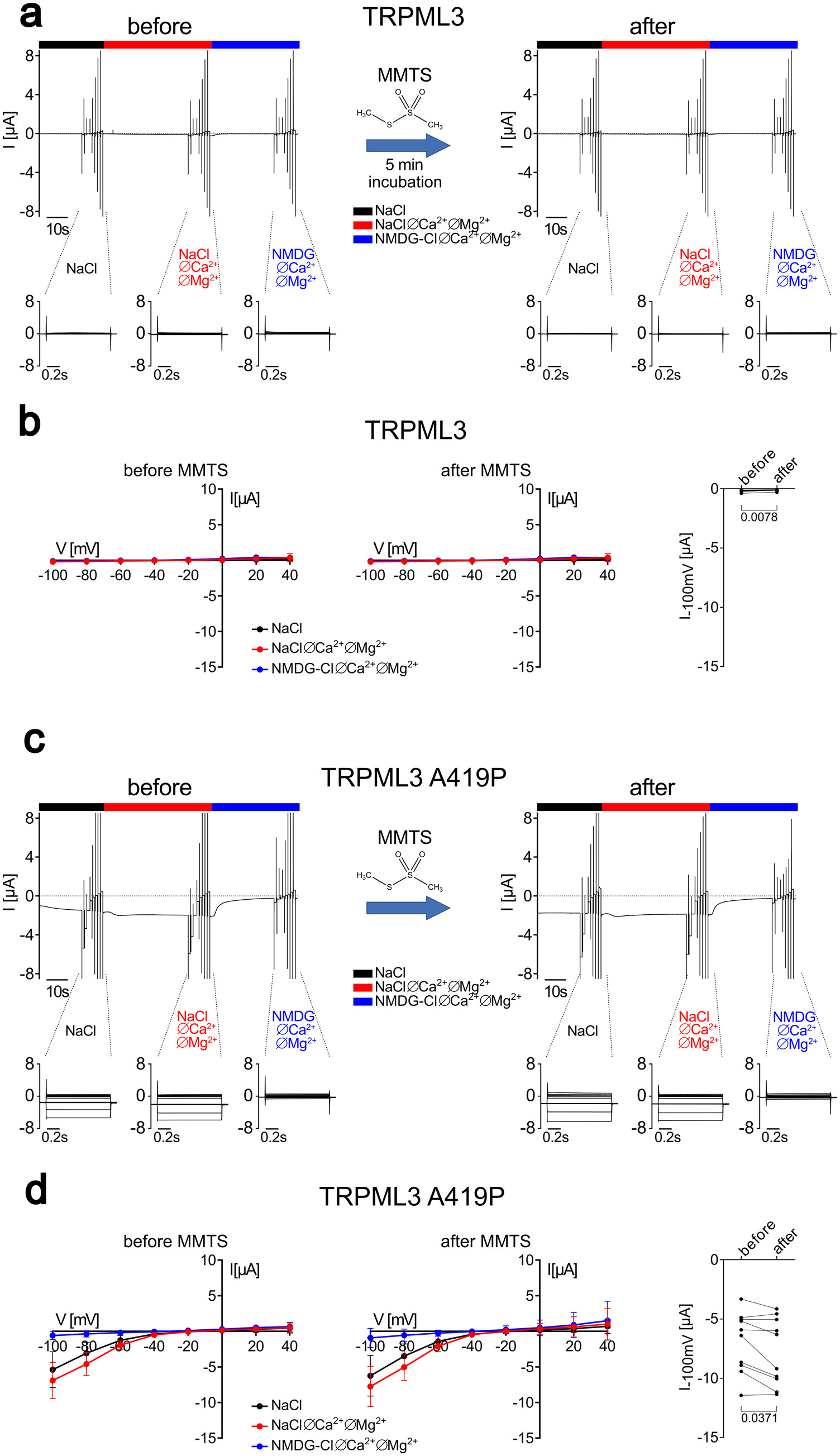 Figure 7 A GOF mutant of TRPML3 (A419P) was not inhibited by MMTS application a, c Representative whole-cell current traces obtained in an oocyte expressing TRPML3 (a) or TRPML3 A419P (c) before (left panels) and after (right panels) 5 min incubation with MMTS (1 mM). Experiments were performed as described in Figure 3. b, d left and middle panels Average I/V plots (mean ± SD) were constructed from similar experiments as shown in a and c as described in Figure 3. Data points represent average values from 8-10 oocytes (b: N=2 n=8; d: N=2 n=10; N indicates the number of different batches of Xenopus laevis oocytes, and n indicates the number of individual oocytes analyzed per experimental group). Right panels Summary data from the experiments shown in corresponding left and middle panels demonstrate maximal inward current values reached at −100 mV in NaCl ØCa2+ØMg2+ solution before and after MMTS application. P-values were calculated using Wilcoxon matched-pairs signed rank test. |