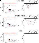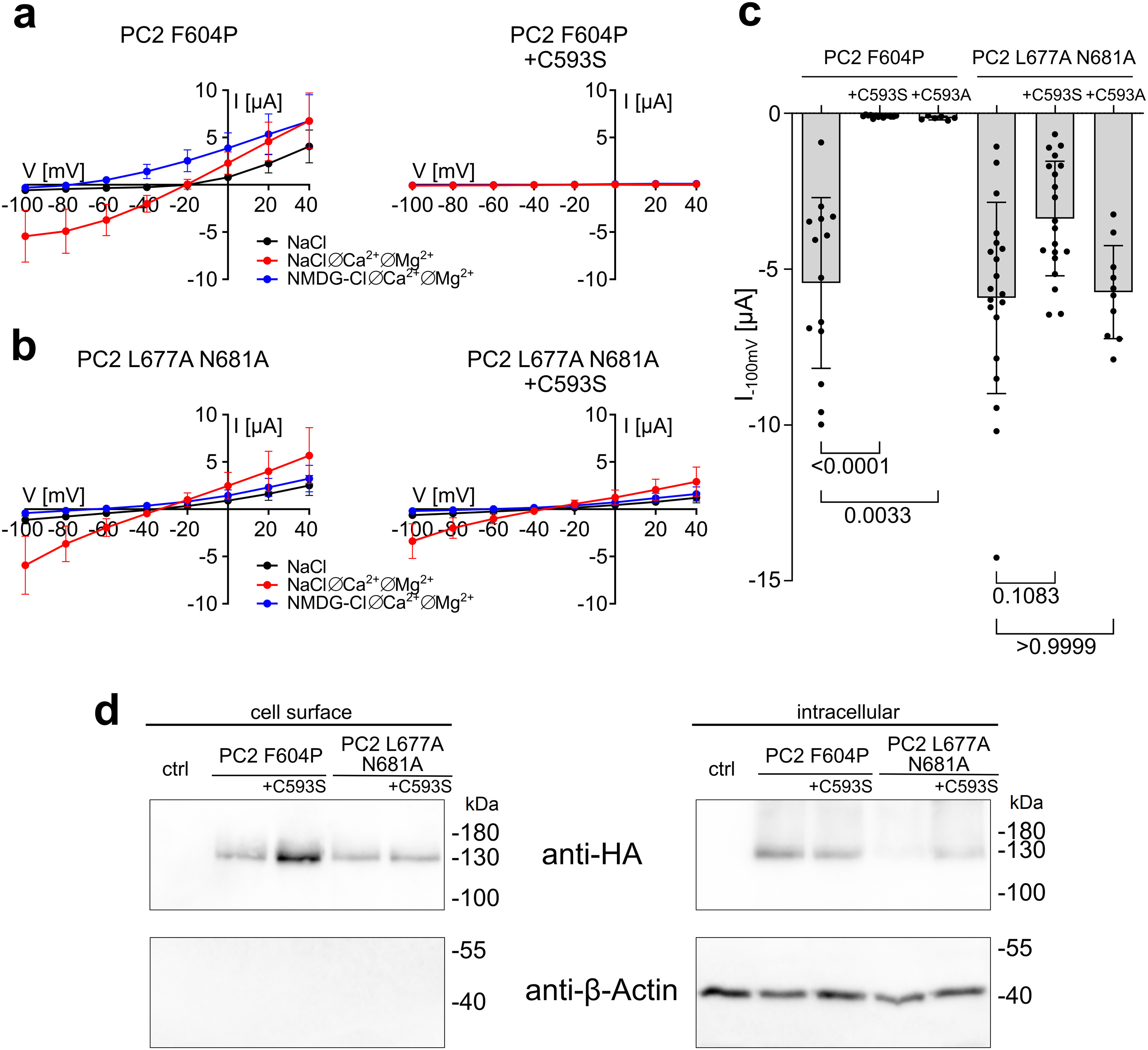 Figure 9 Replacing C593 in the S4-S5 linker by serine inhibited PC2 F604P but not PC2 L677A N681A a, b Average I/V plots (mean ± SD) in different bath solutions as indicated were obtained as described in Figure 3 in oocytes expressing PC2 F604P (a) or PC2 L677A N681A (b) without (left panels) or with (right panels) the additional C593S substitution. c, Summary data from the same experiments shown in a, b and from similar experiments obtained in oocytes expressing the PC2 GOF constructs with the C593A substitution; for each experiment the maximal inward current reached at -100 mV in NaCl ØCa2+ØMg2+ bath solution (mean ± SD is shown as individual data point; N=1-2; n=6-20; N indicates the number of different batches of Xenopus laevis oocytes, and n indicates the number of individual oocytes analyzed per experimental group). P-values were calculated using Kruskal-Wallis and Dunn’s multiple comparisons test. d, Western blot analysis of cell surface (left panels) and intracellular (right panels) expression of PC2 constructs in oocytes from the same batch. PC2 was detected using an antibody against the HA-tag attached to the N-terminus of PC2. The separation of cell surface proteins from intracellular proteins was confirmed by re-probing the stripped western blots with an anti-β-actin antibody. Original uncropped images of the same western blots are shown in Figure S5. |