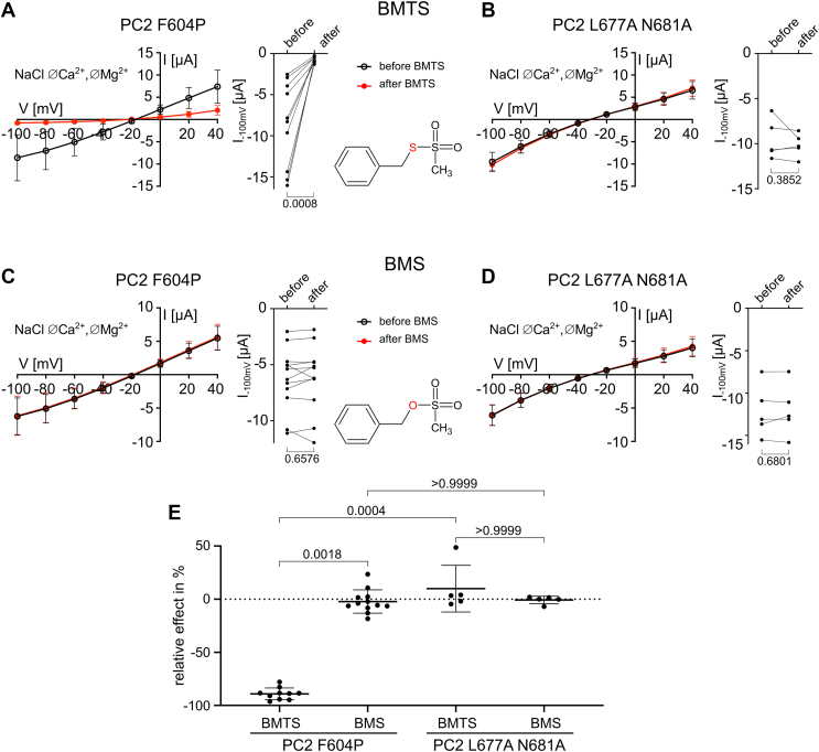 Figure 5. The inhibitory effect of BMTS on PC2 F604P was abolished when its cysteine-reactive MTS group was replaced by an MS group.A–D, whole-cell currents in oocytes expressing PC2 F604P (A, C) or PC2 L677A N681A (B, D) were detected before and after 5 min incubation with BMTS (1 mM; A, B) or BMS (1 mM; C, D). Experiments were performed as described in Figure 3. Left panels Average I/V plots (mean ± SD) obtained in NaCl ØCa2+ØMg2+ solution before and after incubation with BMTS or BMS as indicated. Right panels: summary data from the experiments shown in the corresponding left panels depict maximal inward current values reached at −100 mV before and after incubation with the respective reagent. Lines connect data points obtained from the same oocyte. p values were calculated using paired two-tailed Student's t test. E, relative effect of BMTS or BMS on currents at −100 mV in % was calculated as described in Figure 4C using the current values shown in (A–D). p values were calculated using Kruskal–Wallis and Dunn's multiple comparisons test (N = 2, n = 5–12; N indicates the number of different batches of Xenopus laevis oocytes, and n indicates the number of individual oocytes analyzed per experimental group). PC2, polycystin-2; MTS, methanethiosulfonate; MS, methanesulfonate; BMTS, benzyl methanethiosulfonate; BMS, benzyl methanesulfonate. |