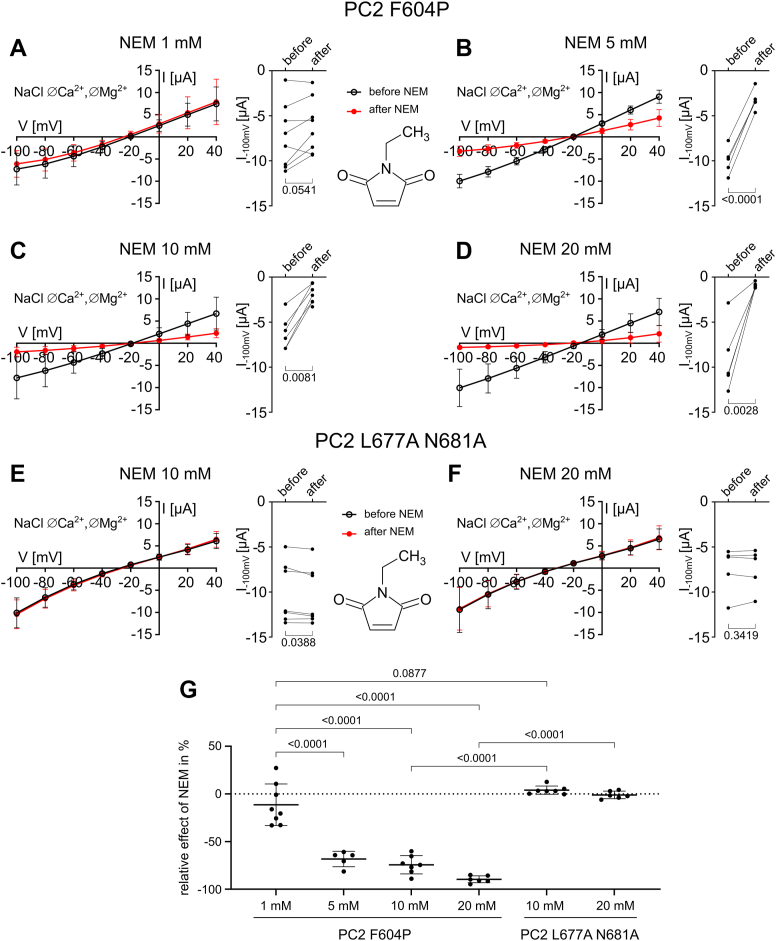 Figure 6. The cysteine-reactive reagent NEM inhibited PC2 F604P but not PC2 L677A N681A.A–F, whole-cell currents in oocytes expressing PC2 F604P (A–D) or PC2 L677A N681A (E, F) were detected before and after 5 min incubation with NEM at the indicated concentrations. Experiments were performed as described in Figure 3. Left panels: average I/V plots (mean ± SD) obtained in NaCl ØCa2+ØMg2+ solution before and after incubation with NEM. Right panels: summary data from the experiments shown in the corresponding left panels depict maximal inward current values reached at −100 mV before and after incubation with NEM. Lines connect data points obtained from the same oocyte. p values were calculated using paired two-tailed Student's t test. G, relative effect of NEM on currents at −100 mV in % was calculated as described in Figure 4C using the current values shown in (A–F). p values were calculated using one-way ANOVA and Šídák's multiple comparisons test (N = 2, n = 5–8; N indicates the number of different batches of Xenopus laevis oocytes, and n indicates the number of individual oocytes analyzed per experimental group). PC2, polycystin-2. |