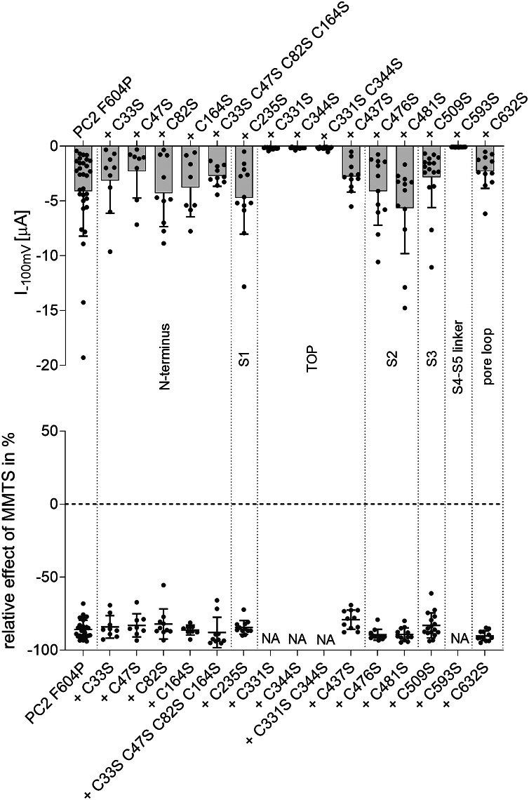 Figure 8. Screening mutagenesis revealed C593 as a crucial cysteine residue for PC2 F604P ion channel function. Whole-cell current values from oocytes expressing PC2 F604P without or with specified cysteine to serine substitutions were obtained essentially as described in Figure 3. Upper panel: maximal baseline inward currents in NaCl ØCa2+ØMg2+ solution at −100 mV (mean + SD and individual data points) are shown. Lower panel: relative inhibitory effect of MMTS in % was calculated as described in Figure 4. This calculation was not applicable (NA) to mutants that exhibited no detectable ion channel activity (N = 1–5, n = 8–31; N indicates the number of different batches of Xenopus laevis oocytes, and n indicates the number of individual oocytes analyzed per experimental group). PC2, polycystin-2; MMTS, methyl methanethiosulfonate. |