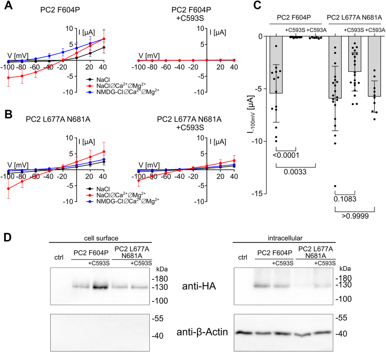 Figure 9. Replacing C593 in the S4-S5 linker by serine inhibited PC2 F604P but not PC2 L677A N681A.A and B, average I/V plots (mean ± SD) in different bath solutions as indicated were obtained as described in Figure 3 in oocytes expressing PC2 F604P (A) or PC2 L677A N681A (B) without (left panels) or with (right panels) the additional C593S substitution. C, summary data from the same experiments shown in (A, B) and from similar experiments obtained in oocytes expressing the PC2 GOF constructs with the C593A substitution; for each experiment the maximal inward current reached at −100 mV in NaCl ØCa2+ØMg2+ bath solution (mean ± SD and individual data points are shown; N = 1–2, n = 6–20; N indicates the number of different batches of Xenopus laevis oocytes, and n indicates the number of individual oocytes analyzed per experimental group). p values were calculated using Kruskal–Wallis and Dunn's multiple comparisons test. D, western blot analysis of cell surface (left panels) and intracellular (right panels) expression of PC2 constructs in oocytes from the same batch. PC2 was detected using an antibody against the HA-tag attached to the N terminus of PC2. The separation of cell surface proteins from intracellular proteins was confirmed by reprobing the stripped western blots with an anti-β-actin antibody. Original uncropped images of the same western blots are shown in Figure S5. PC2, polycystin-2; GOF, gain of function; HA, hemagglutinin. |