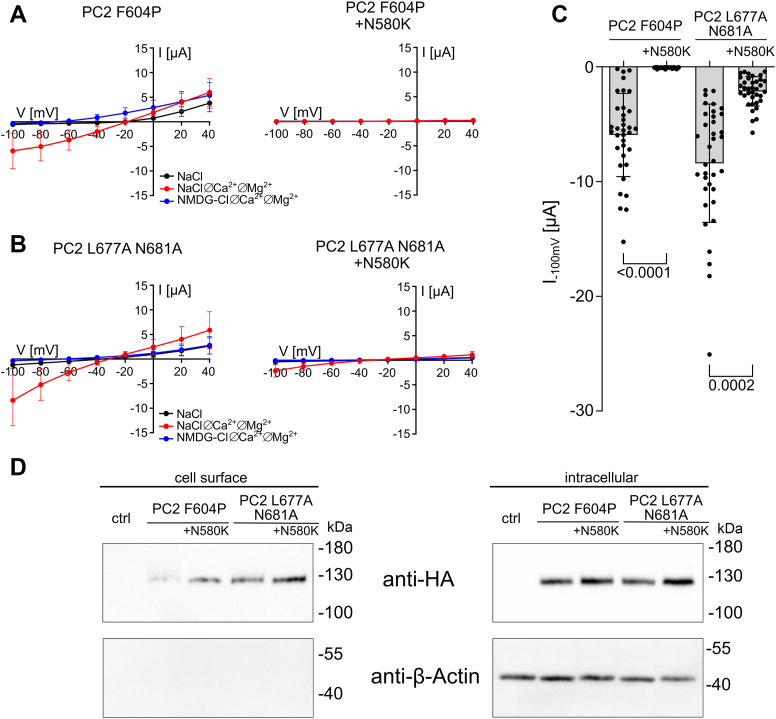 Figure 12. ADPKD-associated mutation N580K in the S4-S5 linker disturbs the ion channel function of PC2 GOF constructs.A and B, average I/V plots (mean ± SD) in different solutions as indicated were obtained as described in Figure 3 in oocytes expressing PC2 F604P (A) or PC2 L677A N681A (B) without (left panels) or with (right panels) the additional ADPKD-associated mutation N580K. C, summary data from the same experiments shown in (A, B) demonstrating maximal inward currents reached at −100 mV in NaCl ØCa2+ØMg2+ bath solution (mean ± SD and individual data points are shown; N = 4, n = 35–36; N indicates the number of different batches of Xenopus laevis oocytes, and n indicates the number of individual oocytes analyzed per experimental group). p values were calculated using Kruskal–Wallis and Dunn’s multiple comparisons test. D, western blot analysis of cell surface (left panels) and intracellular (right panels) expression of PC2 constructs in oocytes from one batch performed as described in Figure 9. Similar results were obtained in three additional experiments shown in Figures S7 to S9. PC2, polycystin-2; ADPKD, autosomal-dominant polycystic kidney disease; GOF, gain of function. |