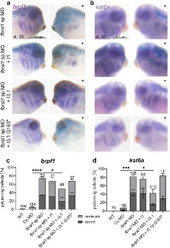 Fig. 4. Fbrsl1 depletion leads to defects in the brpf1 and kat6a expression pattern in Xenopus laevis embryos. Xenopus embryos were injected with 10 ng splice blocking fbrsl1 morpholino (fbrsl1 sp MO) or control morpholino (Co MO) together with 100 pg lacZ or 80 pg gfp mRNA as a lineage tracer in one blastomere at the two-cell stage. At tadpole stages (stage 33), the brpf1 or kat6a expression was analyzed by in situ hybridization. The injected side is indicated by a star. WT wild-type embryos. a, c Embryos analyzed for brpf1 expression. b, d Embryos analyzed for kat6a expression. c, d Graphs summarize brpf1 and kat6a patterning defects of four to six independent experiments. The bar charts show the mean value along with the standard error of the mean value. The number of embryos evaluated is indicated in all diagrams. One-way ANOVA followed by Tukeys post hoc test was used to evaluate statistical significance (****p0.0001). WT wild-type, st stage |
