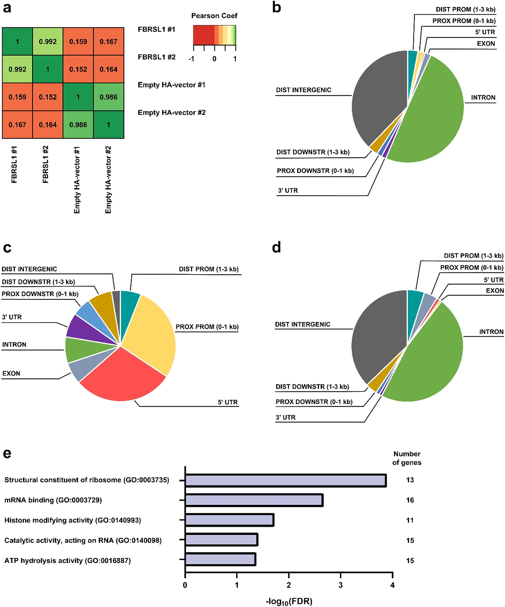 Fig. 1 ChIP-Seq analysis of FBRSL1 targets after overexpression in HEK293 cells. a Heatmaps showing the Pearson correlation coefficient of the pairwise comparison of peak tag numbers. b–d Pie charts showing the localization of ChIP-Seq peaks relative to genomic annotations for (b) random control, (c) HA-FBRSL1-I1-pcDNA3.1, and (d) empty HA-pcDNA3.1 vector. The peak distribution shown represents one of the two biological replicates in each case. e Over-representation analysis (ORA) of FBRSL1 targets for Gene Ontology terms related to molecular function. Only FBRSL1 target genes with peaks in both FBRSL1 replicates located ± 5 kb from the transcription start site were considered. Benjamini-Hochberg procedure with a false-discovery rate set to 0.05 was performed using WebGestalt (https://www.webgestalt.org). Coef Coefficient, DIST Distal, PROX Proximal, PROM Promotor, DOWNSTR downstream, UTR untranslated region, GO Gene Ontology, FDR false-discovery rate