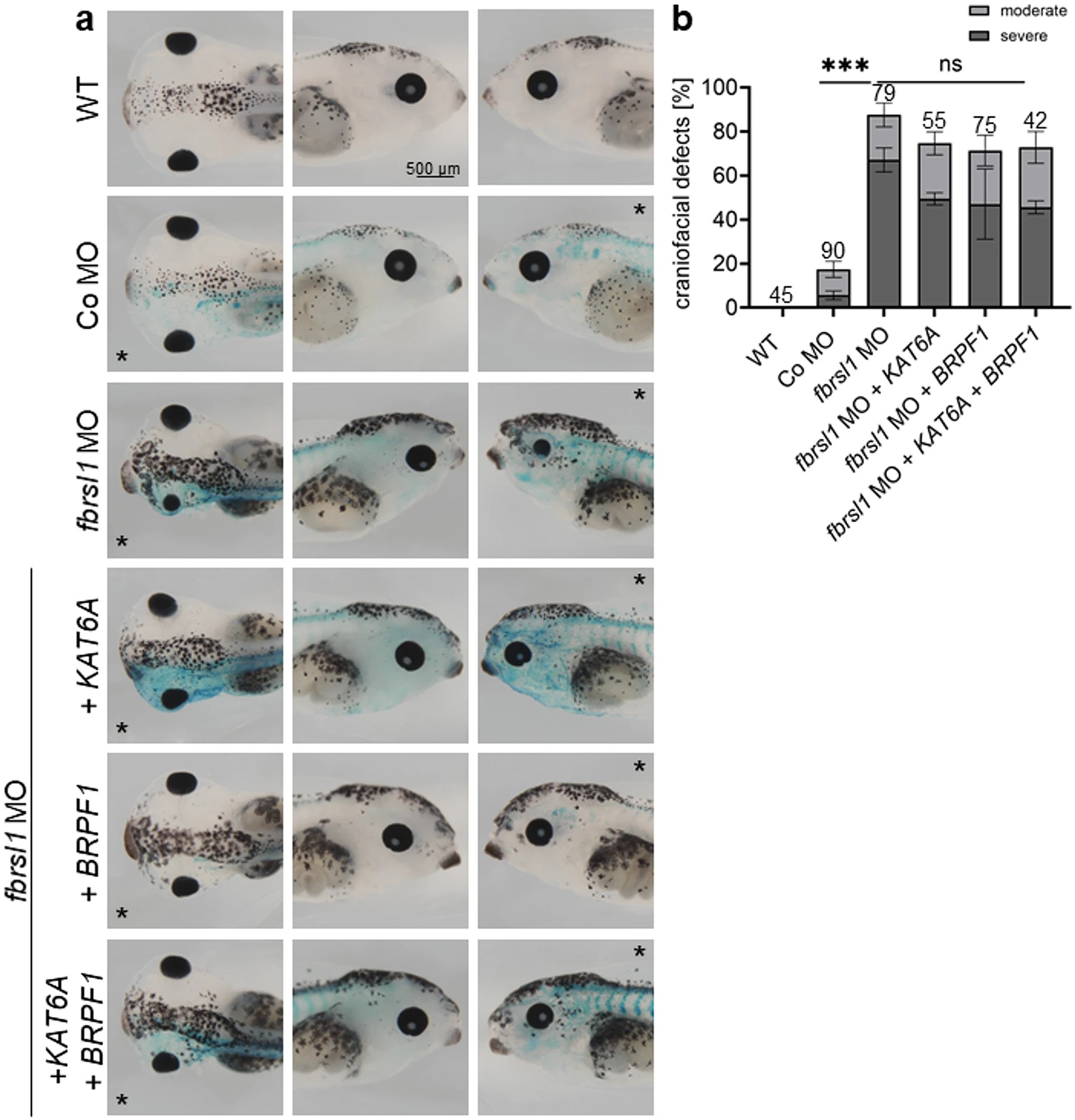 Fig. 6. Co-injection of human BRPF1 and KAT6A in Xenopus laevis embryos is not sufficient to rescue the craniofacial defects caused by fbrsl1 depletion. Xenopus embryos were injected with the fbrsl1 sp MO or Co MO in combination with plasmids containing human BRPF1 and KAT6A in one blastomere at the two-cell stage as indicated. For lineage tracing, 80 pg lacZ mRNA was co-injected. The star marks the injected side. Embryos were phenotypically analyzed for craniofacial defects at stage 43. a, b Embryos injected with the fbrsl1 MO show a strong reduction of craniofacial tissue on the injected side. Co-injection of embryos with human BRPF1 and KAT6A, alone or in combination, leads to a mild rescue of craniofacial defects. b Graph summarizes craniofacial defects of three independent experiments. The bar charts show the mean value along with the standard error of the mean value. The number of embryos evaluated is indicated in all diagrams. One-way ANOVA followed by Tukeys post hoc test was used to evaluate statistical significance (***p0.001). WT wild-type, ns not significant