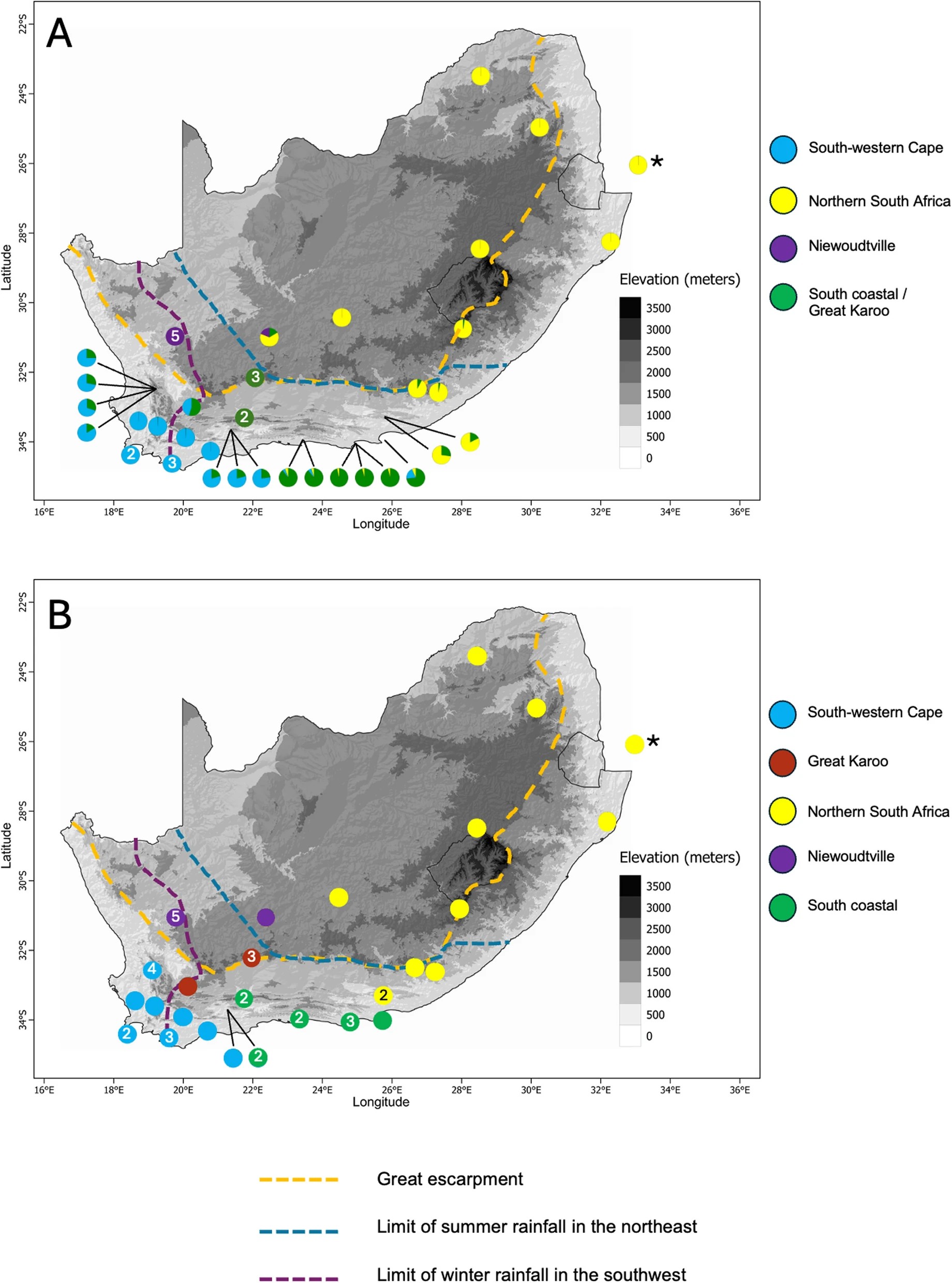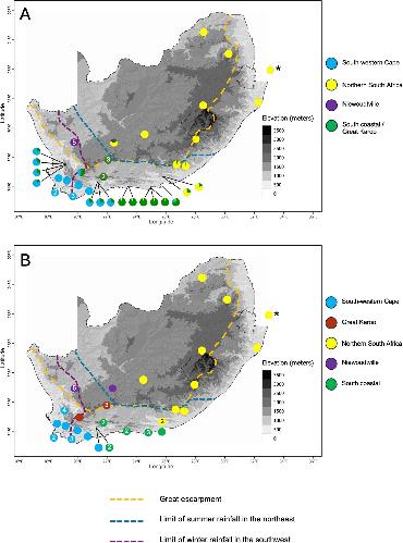 Fig. 2. Geographic partitioning of genetic variation of Xenopus laevis in South Africa. A- Distribution of genetic variation based on nuclear SNPs. B- Distribution of mitochondrial clades. Numbers indicate the number of individuals from the same locality that harbour the same genetic composition