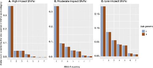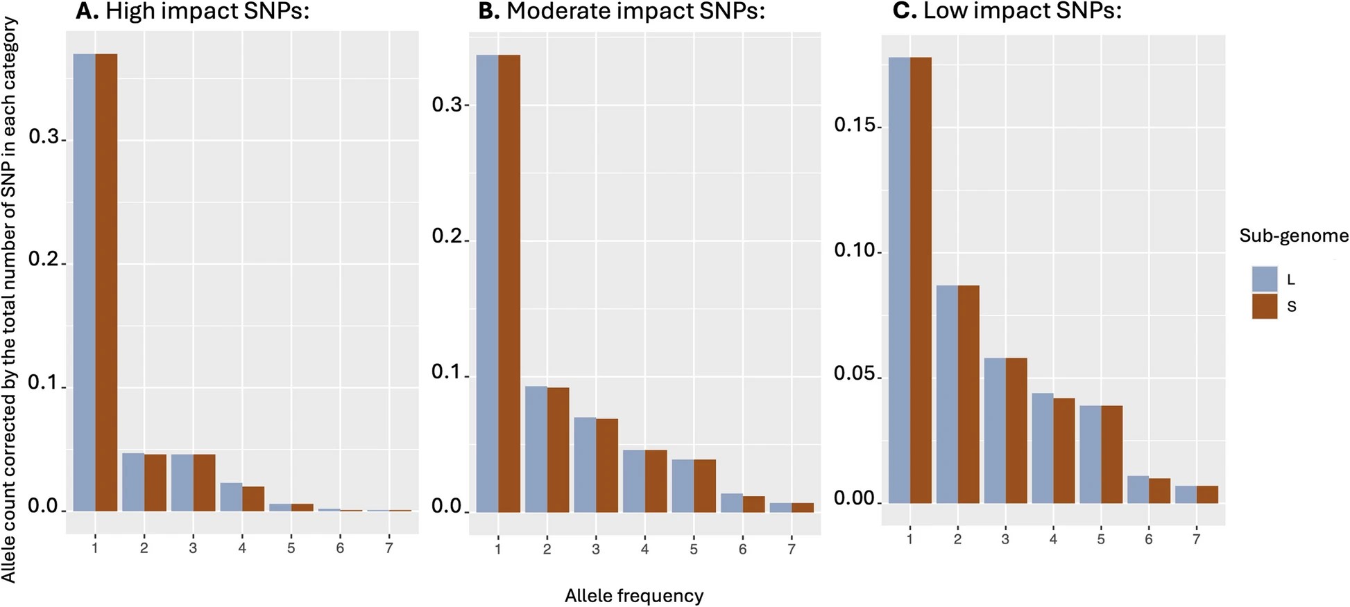 Fig. 6. Allele frequency spectra for variants classified by SNPEff as high, moderate or low effects. The data are from the south western Cape populations and includes only non-admixed individuals.