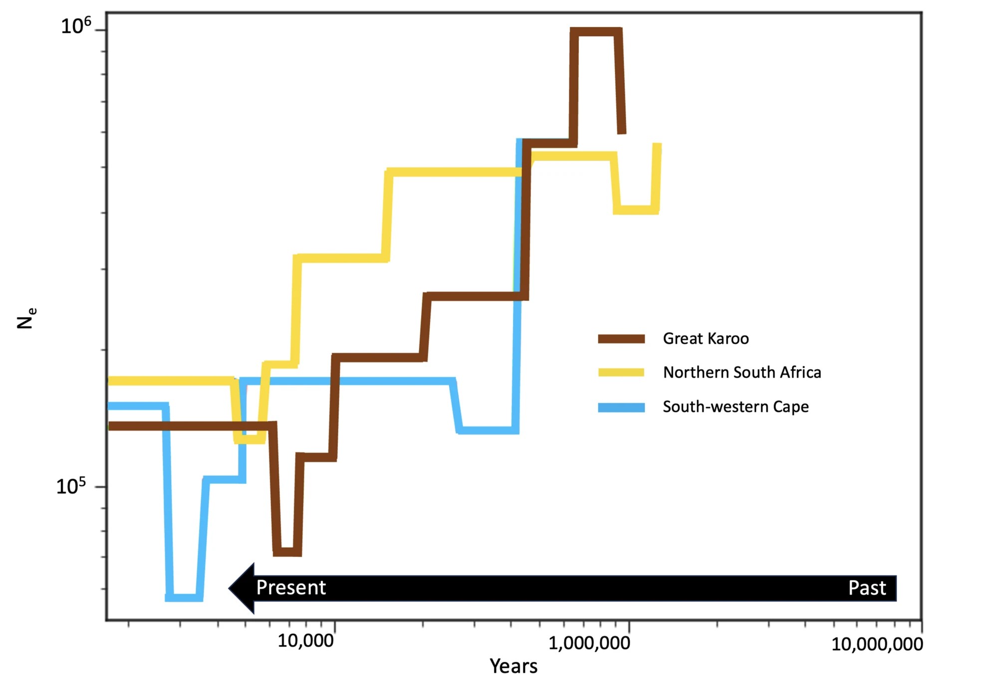Fig. 3. Demographic reconstruction of the three main population using SMC + + (Niewoudville population and admixed individuals were excluded). The right side of the figure represents past population size and the left side indicates more recent population size. Ne = effective population size.