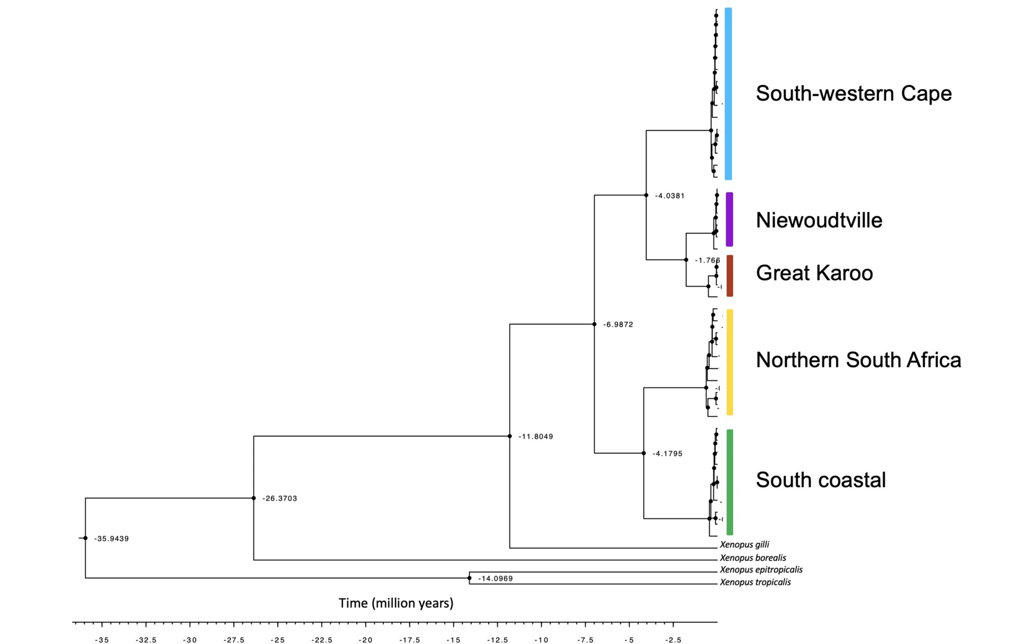 Fig. 4. Dated mitochondrial phylogeny. The Calibrated Bayesian tree of mitogenome sequences was set on the divergence between Silurana and Xenopus estimated based on molecular and fossil data to be around 36Mya (27-51Mya)