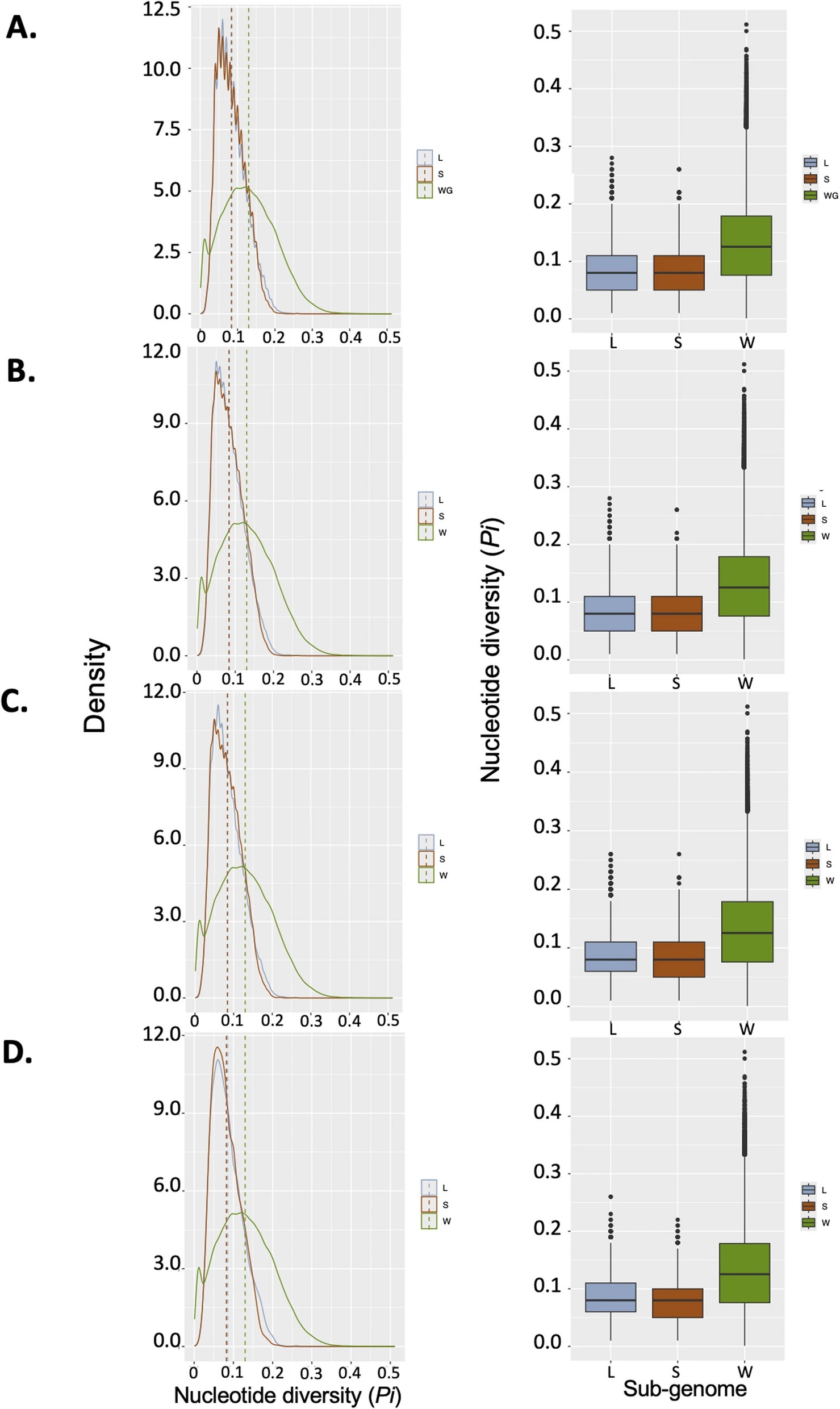 Fig. 5. Comparison of nucleotide diversity between the L and S sub-genomes around exons. The left side of each panel shows the density distribution of nucleotide diversity for exons located on the L and S sub-genomes as well as for the whole genome average (W). The right side shows the same data as boxplots. A- All exons combined. B- First exons. C- Last exons. D- Single exon genes. The listed colors in the vignettes are light blue for the L sub-genome, brown for the S sub-genome, and green for whole genome data