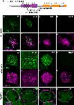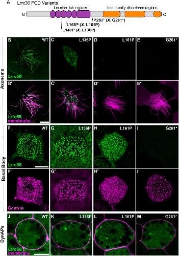 Fig. 2. Lrrc56 primary ciliary dyskinesia variants show a spectrum of localization defects. (A) Schematic of LRRC56 (UniProt ID: Q8IYG6), showing the leucine-rich regions and long intrinsically disordered C-terminus. The location of three human primary ciliary dyskinesia (PCD) variants L140P, L165P and D266* is indicated. The corresponding Xenopus alleles are in parentheses and indicated by ‘X’. (B,C,D,E) En face images of single MCCs showing Lrrc56 (green) axoneme localization for wild-type (WT; B), L136P (human L140P; C), L161P (human L165P; D), and D261* (human P263*; E) variants. Lrrc56 axonemal localization is disrupted in all three variants. (B′,C′,D′,E′) Merged images showing Lrrc56 (green) with membrane labeling (magenta) reveal normal motile cilia structure. (F,G,H,I) Representative en face images of Lrrc56 basal body localization for WT (F), L136P (G), L161P (H) and G261* (I) variants. Variants located at leucine-rich domains show normal localization to basal bodies, but G261* variant fails to localize at basal bodies. (F′,G′,H′,I′) Centrin (magenta) labeling of basal bodies for the corresponding WT (F′), L136P (G′), L161P (H′) and G261* (I′) variants. (J-M) Merged channels showing Lrrc56 (green) and membrane (magenta) show cytosolic localization for WT (J), L136P (K), L161P (L) and G261* (M) variants. Scale bars: 10 µm. This experiment was independently replicated at least three times, with (n=3) randomly selected embryos from each batch used per replicate. |
