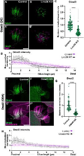 Fig. 5. Lrrc56 knockdown alters Odad3 localization at distal end of the motile axoneme. (A) In control MCCs, the docking complex subunit Odad3 (green) localizes along the length of the motile cilium. (A′) Merged image showing Odad3 (green) and the distal tip marker Spef1 (magenta). Odad3 is enriched throughout the axoneme, excluding the Spef1-positive distal domain. (B) In Lrrc56 KD MCCs, Odad3 localization to axonemes is decreased. (B′) Merged image of Odad3 (green) and Spef1 (magenta) in Lrrc56 KD cilia shows reduced Odad3 intensity along the axoneme. (C) Quantification of normalized Odad3 mean intensity in control and Lrrc56 KD MCCs. Mean intensity was measured from the base of the cilium to the beginning of Spef1 domain in individual cilia; mean intensity was normalized to membrane marker; each dot represents a motile cilium. (D) Quantification of raw mean normalized Odad3 intensity along the axoneme in control and Lrrc56 KD MCCs. In Lrrc56 KD MCCs, Odad3 signal is enriched at the proximal end of the axoneme compared to controls (control, N=33; Odad3 KD, N=33). (E) The ODA subunit Dnai2 (green) localizes along the axoneme in control MCCs. (F) In Odad3 KD MCCs, Dnai2 intensity is reduced along the axoneme, particularly at the distal end. (E′,F′) Merged image of Dnai2 (green) and a membrane marker (magenta) in control (E′) and Odad3 KD (F′) MCCs. (G) Quantification of Dnai2 mean intensity in control and Lrrc56 KD MCCs, normalized to a membrane marker. (H) Quantification of Dnai2 intensity along the cilium in control and odad3 KD MCCs. Plot shows representative axonemes (control, N=33; Odad3 KD, N=21). Statistical significance was determined using a non-parametric Mann–Whitney U-test. ****P<0.0001. Scale bars: 10 µm. |