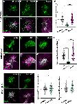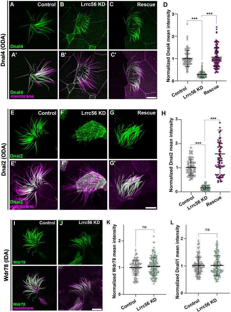 Fig. 3. Lrrc56 is essential for ODA deployment to axonemes. (A) GFP-Dnal4 labeling of motile axonemes in control MCCs shows normal localization ODA subunits. (A′) Merged channels (membrane labeled with CAAX-RFP, magenta and Dnal4, green) reveal normal cilia morphology in control MCCs. (B) GFP-Dnal4 is absent from motile cilia in Lrrc56 knockdown (KD) MCCs. (B′) Membrane labeling (magenta) in merged channels shows normal motile cilia morphology despite Lrrc56 KD. (C) GFP-Dnal4 is restored to Lrrc56 KD motile cilia after ectopic expression of FLAG-Lrrc56. (C′) Merged channels show membrane (magenta) and Dnal4 (green) labeling in rescued MCCs. (D) Quantification of mean±s.d. of normalized GFP-Dnal4 fluorescence (see Materials and Methods) in axonemes of control (n=91), Lrrc56 KD (n=97) and rescue (n=11) MCCs. N>25 cells from nine embryos across three experiments for all conditions. (E,F,G) GFP-Dnai2 labeling of motile axonemes in control (E), Lrrc56 KD (F) and rescue (G) MCCs. GFP-Dnai2 shows normal localization in control MCCs but is lost from axonemes in Lrrc56 KD MCCs. Loss of GFP-Dnai2 is restored after ectopic expression of Lrrc56. (E′,F′,G′) Merged channels show membrane (magenta) and Dnai2 (green) labeling for cells in panels E, F and G, respectively. (H) Quantification of normalized GFP-Dnai2 mean intensity along axonemes in control (n=73), Lrrc56 KD (n=73) and rescue (n=74) MCCs. N>25 cells from nine embryos across three experiments for all conditions. (I) GFP-Wdr78 labeling of IDA subunits shows normal localization in motile axonemes. (J) GFP-Wdr78 remains localized to motile cilia in Lrrc56 KD MCCs. Merged channels (bottom row) show normal cilia morphology in both control and Lrrc56 KD MCCs, with membrane (magenta) and Wdr78 (green) labeling. (K,L) Graphs showing mean intensity of normalized IDA subunits Wdr78 (K) and Dnali4 (L) in control and Lrrc56 KD MCCs. Data are presented as mean±s.d, with error bars representing independent biological replicates. Statistical significance was determined using a non-parametric Mann–Whitney U-test for two-group comparisons and a one-way ANOVA for comparisons involving more than two groups. ***P<0.001; ns, P>0.05. Scale bars: 10 µm. |
