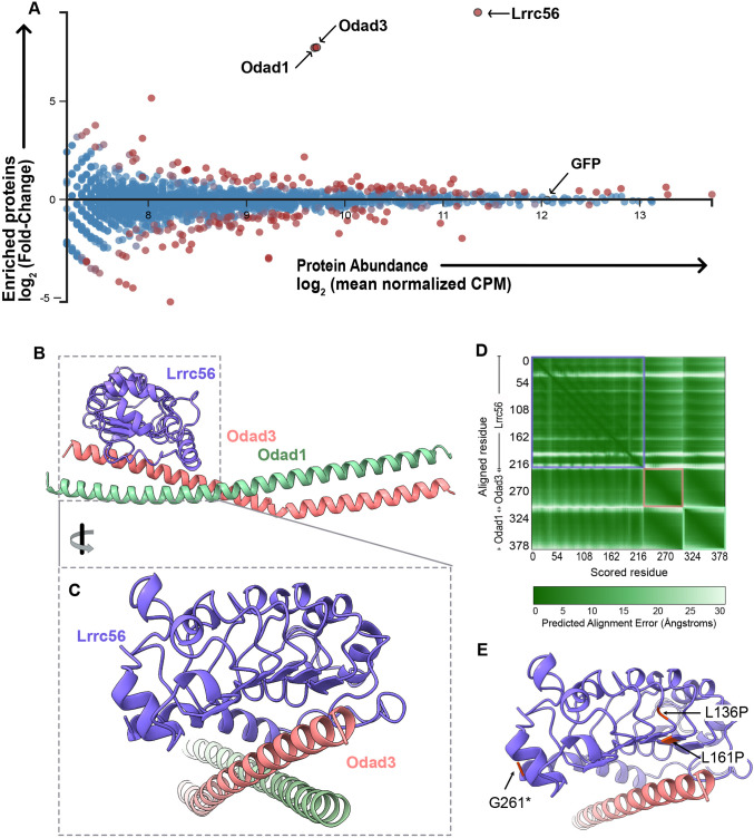 Fig. 4. In vivo affinity purification-mass spectrometry reveals novel interactors of Lrrc56. (A) MA plot of enriched proteins (log2 fold change) and average abundance between GFP-Lrrc56 (experiment) and GFP (control) immunoprecipitated proteins. Top hits are indicated with arrows. Lrrc56 (bait) is highly enriched and abundant in the experiment group. Odad1 and Odad3 are the top two enriched proteins in Lrrc56 IP group. GFP remains unchanged between control and experiment groups. MA plot was generated from two independent biological replicate experiments (see Materials and Methods). CPM, counts per million. (B) AlphaFold3-predicted structure of Xenopus Lrrc56 and its interactors, Odad3 and Odad1. Each monomer is color coded as indicated. The model includes residues 42-261 of Lrrc56, 162-239 of Odad3 and 137-220 of Odad1. (C) Enlarged view of the Lrrc56-Odad3 interface. (D) Predicted aligned error plot for the interaction between Xenopus Lrrc56, Odad3 and Odad1 in the model shown in B. (E) Close-up of the Lrrc56-Odad3 interface in the AlphaFold3 model, highlighting the positions of Lrrc56 ciliopathy-associated variants (L136P, L161P and G261*). |