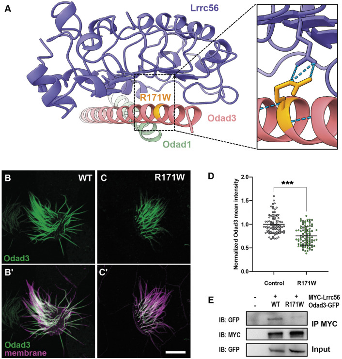 Fig. 6. An Odad3 variant of unknown function disrupts interaction with Lrrc56. (A) AlphaFold3 model of Xenopus Lrrc56, Odad3 and Odad1, highlighting the location of the R171W (human E207W) variant of unknown function in Odad3. Inset shows a close-up of the Lrrc56-Odad3 interface, showing predicted interaction of R171 residue and Lrrc56 E96 residue. (B) WT localization of GFP-Odad3 in MCCs. Odad3 (green) localizes along the axoneme except for the most distal end of the cilium. (C) Expression of the R171W allele in MCCs disrupted its localization to axonemes compared to that in controls. (B′,C′) Merged image of Odad3 (green) and a membrane marker (magenta) in control (B′) and R171W allele (C′) MCCs. (D) Quantification of normalized mean Odad3 intensity along the motile cilium, showing decreased GFP signal R171W compared to that in controls (WT). Statistical significance was determined using a non-parametric Mann–Whitney U-test. ***P<0.0002. Scale bar: 10 µm. Three embryos (N=3) were analyzed; within each embryo, a minimum of three MCCs were imaged, and three to five individual cilia per cell were quantified. (E) Co-immunoprecipitation (IP) of Lrrc56 and Odad3. Representative western blot of IP of MYC-Lrrc56 and Odad3-GFP, and of input GFP, between WT and R171W allele. For total protein isolation, n=20 embryos per group were lysed in sample buffer. |