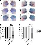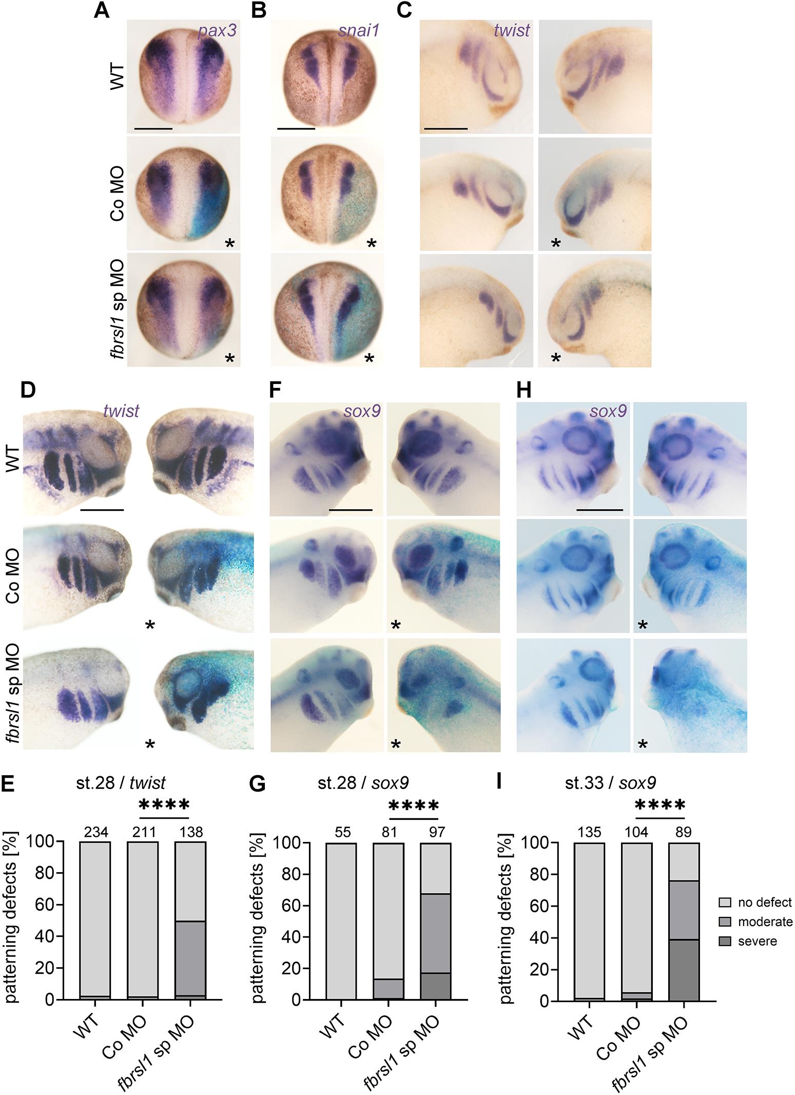 Fig. 1. Fbrsl1 loss of function does not affect NC induction, specification and early migration, but later stages of NC development. Embryos were uninjected, injected with 15 ng Co MO or injected with 10 ng fbrsl1 sp MO and 80-100 pg lacZ mRNA at the two-cell stage and analyzed by whole-mount in situ hybridization using NC markers as indicated. Asterisks indicate the injected side, which is also visible by the blue LacZ staining. WT, wild type (uninjected control). Scale bars: 500 µm. (A) Dorsal views of a stage 14 embryos analyzed for expression of the neural plate border marker pax3. (B) Dorsal views of stage 16 embryos analyzed for the expression of snai1, indicating premigratory NC cells. (C) Lateral views of stage 23 embryos showing early migrating NC cells marked by twist expression. (D) Lateral views of stage 28 embryos showing patterning defects of twist-expressing NC cells compared to controls. (F) The same was seen for the sox9 expression pattern at stage 28. (H) These defects were even more severe when embryos were analyzed at stage 33. (E,G,I) Data relating to D,F,H, respectively, presented as a percentage of the total, based on at least three independent experiments. The number of analyzed embryos is indicated; ****P≤0.0001 (two-sided Fisher's exact test). |