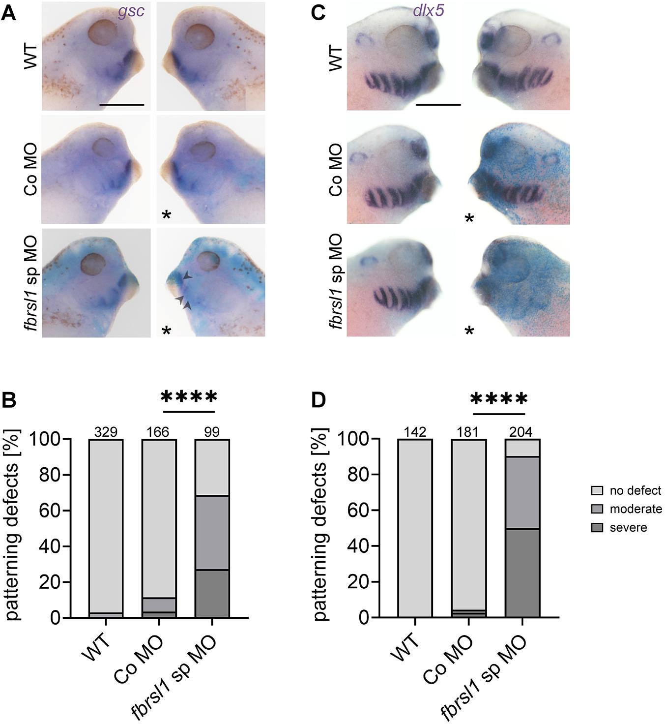 Fig. 4. Fbrsl1 is required for gsc and dlx expression. (A,C) Embryos were injected at the two-cell stage with 10 ng of Co MO or fbrsl1 sp MO, together with 80-100 pg of lacZ mRNA for lineage tracing. At stage 33-35, embryos were analyzed by whole-mount in situ hybridization for gsc or dlx5 expression. Lateral views of the embryos are shown. Asterisks indicate the injected side. Scale bar: 500 µm. (A) fbrsl1 morphants show a reduction in gsc expression compared to controls. Arrowheads mark the affected area. (B) Graph summarizing defects in the gsc expression pattern of three independent experiments. (C) dlx5 expression is reduced in fbrsl1 morphant embryos. (D) Graph summarizing defects in the dlx5 expression pattern of four independent experiments. Data in B and D are presented as a percentage of the total. The number of analyzed embryos are indicated; ****P≤0.0001 (two-sided Fisher's exact test). fbrsl1 sp MO images in A and C are also shown in Fig. S2. |