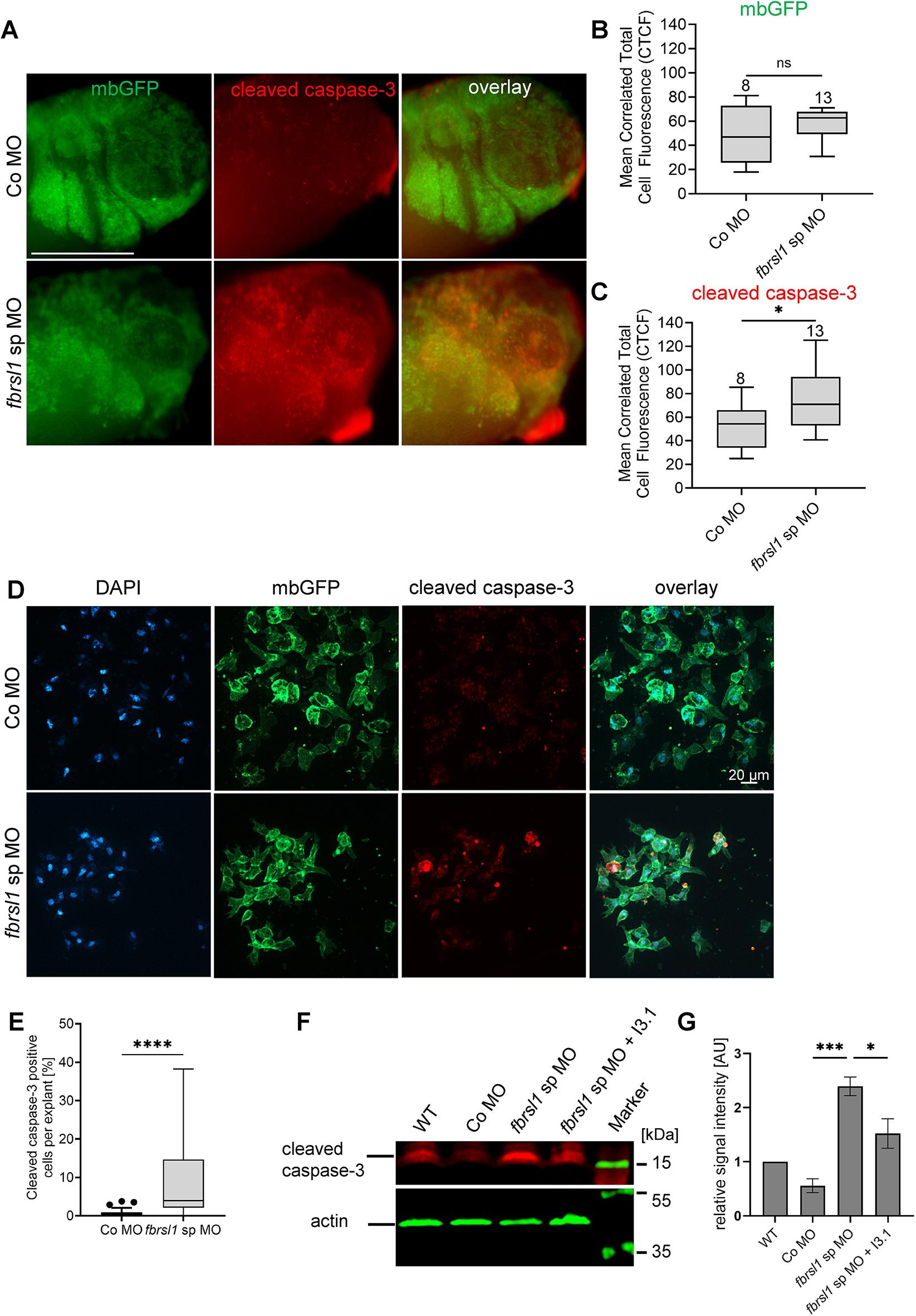 Fig. 6. Cleaved caspase-3 signal intensity is increased in the branchial arch area of Fbrsl1-depleted embryos and in explanted NC cells. (A-C) Xenopus embryos were injected with 10 ng of Co MO or fbrsl1 sp MO, together with 100 pg mbGFP RNA for lineage tracing in one blastomere at the two-cell stage. Embryos were analyzed by immunostaining for cleaved caspase-3 at stage 31/32. (A) Co MO-injected embryos showed weak cleaved caspase-3 expression, which was increased in embryos injected with the fbrsl1 sp MO. Cleaved caspase-3 expression localized to the area of cranial NC migration. Scale bar: 500 µm. (B,C) Boxplots with Tukey's whiskers set at 1.5 times the IQR summarize data from three independent experiments analyzing CTCF intensity of mbGFP (B) or cleaved caspase-3 (C). The median is indicated by a line within the box; the boxes extend from the 25th to the 75th percentile. The number of embryos analyzed is indicated above each box; ns, not significant; *P≤0.05 (unpaired Student's t-test). (B) CTCF intensity of mbGFP does not significantly change between Co MO and fbrsl1 sp MO-injected embryos. (C) Cleaved caspase-3 CTCF intensity is significantly increased in embryos injected with fbrsl1 sp MO in comparison to Co MO-injected embryos. (D) NC explants of embryos were injected with 10 ng of Co MO or fbrsl1 sp MO, together with 150 pg mbGFP RNA. GFP and cleaved caspase-3 expression was analyzed by immunostaining. (E) Graph showing the percentage of cleaved caspase-3-expressing cells in fbrsl1 morphant and control NC cells of three independent experiments. ****P≤0.0001 (Mann–Whitney test). Boxplots with Tukey's whiskers set at 1.5 times the IQR; dots represent outliers; the median is indicated by a line within the box; the boxes extend from the 25th to the 75th percentile). (F) Xenopus embryos were injected with 20 ng of Co MO or fbrsl1 sp MO, together with 100 pg GFP RNA in the animal pole at the one-cell stage. For rescue experiments, 400 pg human HA-FBRSL1-I3.1-pcDNA3.1 (I3.1) was co-injected. The levels of cleaved caspase-3 were analyzed by western blotting at stage 33. A representative western blot is shown. Molecular masses (kDa) are indicated. (G) The ratio of signal intensity levels of cleaved caspase-3 to actin was normalized to wild-type cleaved caspase-3 levels and plotted. The graph summarizes three independent experiments. Data are mean±s.e.m. Cleaved caspase-3 protein levels significantly increased in Fbrsl1-depleted embryos. This effect was partially rescued by co-injection of I3.1. *P≤0.05, ***P≤0.001 (one-way ANOVA with Tukey's multiple comparison test). |