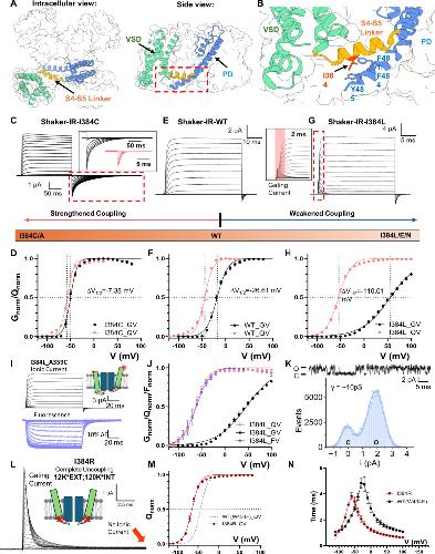 Fig. 1. I384 residue controls electromechanical coupling in the Shaker potassium channel.A Structure of the Shaker channel (PDB:7SIP). Voltage-sensing domains (VSD) and pore domains (PD) and S4–S5 helixes are labeled. B Location of I384 at the VSD–PD interface and its contacting residues. C, D The I384C mutant shows markedly slower deactivation compared to WT, with GV curves (N = 4) sharper and more closely aligned with QV (N = 5). Inset shows the tail current of I384C in black and WT in red returning to −120 mV. E, F WT displays typical ionic and gating currents, with GV and QV (n = 3 for both) separated. G–H I384L requires stronger depolarization for activation, with a shallower GV slope (N = 4) and altered gating current (N = 5) The inset highlights the coexistence of both gating and ionic current at the beginning of the pulse. I, J Fluorescence recordings from a TMR labeled I384L (A359C) suggest normal VSD movements (N = 3 for GV/QV/FV curves). Note there is no slow component in the fluorescence traces. K Single-channel recordings from I384L reveal unchanged conductance but increased flickering. L, M I384R abolishes ionic conduction in 12 external K+, leaving only gating currents, with the QV shifted strongly to negative voltages (N = 4 for I384R). N Gating current kinetics of I384R are faster than WT in the W434F background (N = 3 for both). All the data are shown as Mean ± SEM and N is the number biological replicates. For C, E, G, prepulse and returning pulse are both -120 mV and ∆V = 10 mV. For D, F, H, the data were fitted with a two-state model (details in method section) for easy visualization and calculation of change in ∆V1/2. Fitting results could be found in Supplementary Tables 1-2. |