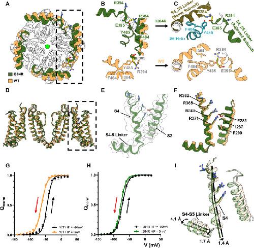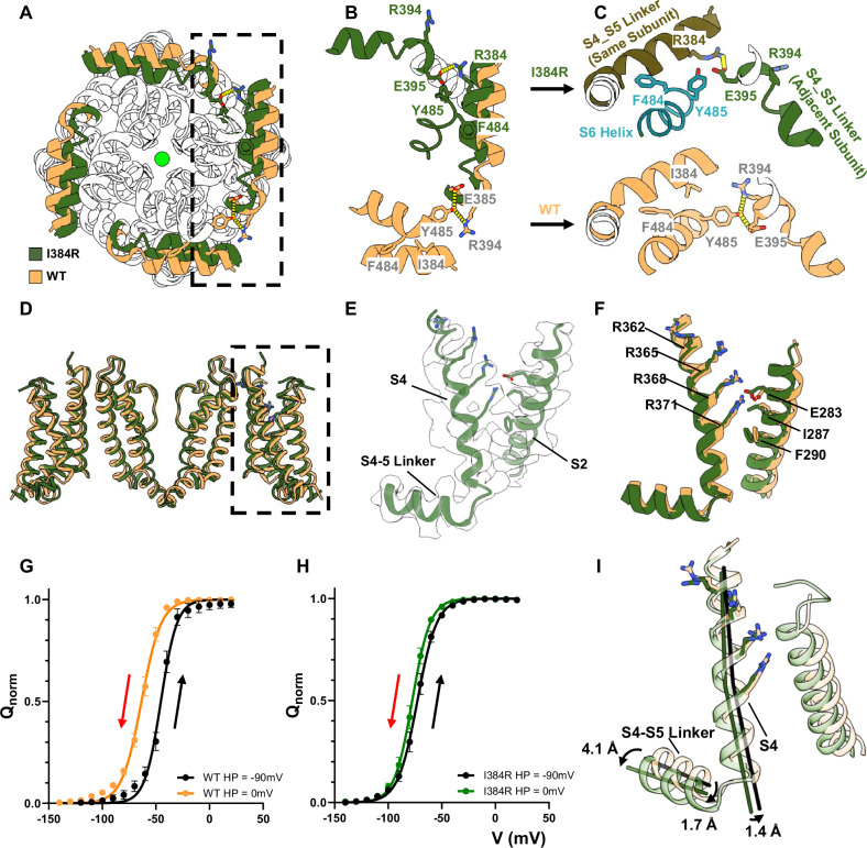 Fig. 3. A tripartite interaction pocket for electromechanical coupling and the structure of activated but not relaxed voltage sensors.A Intracellular view of the uncoupled structure (green) and coupled structure (orange) with their S4-S5 linkers highlighted. In the uncoupled structure, S4-S5 linkers undergo a translational movement towards the pore, forming a much tighter collar around the S6 helices. B, C In the coupled structure (orange), Y485 at the bottom of the S6 helix interacts with E395 and R394 in the C-terminus end of the S4-S5 linker from the adjacent subunit. I384 from the same subunit is lodged in a hydrophobic pocket formed by F484 and Y485. In the uncoupled structure (green), however, R384 jumps out of the hydrophobic pocket and forms a salt bridge with E395 in the adjacent unit, which repulses R394 away from facing the S6 helix, abolishing completely the interactions with Y485. D Side view of the VSD of the uncoupled channel and the WT channel. E Coulombic density for the VSD in I384R. All the side chains of the gating charges can be clearly resolved. F Comparison of the WT and I384R voltage sensors. In both cases, all gating charges (R362, R365, R368, and R371) have moved passed the hydrophobic plug around the I287 and F290 region. Both VSDs are in a fully activated state. G, H Hysteresis of the VSDs in WT and I384R (N = 4 for both). Holding at 0 mV for a prolonged time (>15 s) leads to a ~20 mV shift of the QV curve to the left in the WT channels. However, in I384R, no such shift was observed. It seems that at 0 mV, the VSDs in I384R do not enter the relaxed state. I Helical movements in S4 due to the S4-S5 linker. The tight conformation of the S4-S5 linker shifted the C terminus of the S4-S5 linker by 4.1 Å. This shift is transduced to the N-terminus end of the linker and the S4 helix as well, shifting them 1.7 Å and 1.4 Å, respectively. Data are shown as Mean ± SEM. N is the number of biological replicates. |