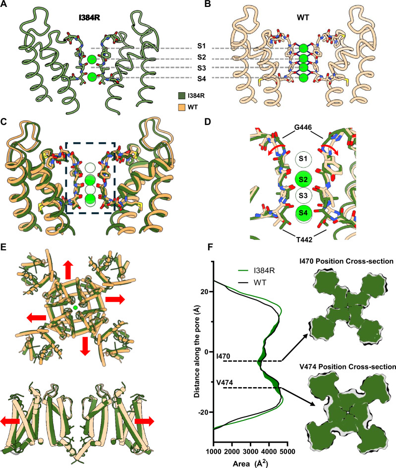 Fig. 2. Cryo-EM structure of uncoupled I384R channel, captured in a closed state.A Side view of I384R. The model is shown overlapping with the electron density, with the intracellular T1 domain omitted. Global resolution is 3.5 Å. B Intracellular view of I384R. Like previous solved structures, I384R adopts a domain-swapped arrangement. C Structure of the pore in I384R (green) compared to the open state (orange, PDB:7SIP) from the side view. A rotational movement in upper S6 helices (highlighted by arrows) positions two hydrophobic residues, I470 and V474, from the side directly into the permeation pathway. D Intracellular view of the pore in I384R (green) and WT (orange). In addition to the rotational movement, a translational movement of S6 helices towards the pore is observed in the closed state structure, further constraining the pore. E Radius profiles of the open pore from the WT channel. The inner cavity and bundle crossing are both open. The dashed vertical line indicates the approximate size of hydrated K+ ion. F Radius profile of pore in the uncoupled channel. The pore shows two constriction sites, one at I470 in the inner cavity and the other at V474 in the PVP motif. The Narrowest point of the pore is less than ~1 Å, indicated by the dashed red line. Clearly, the pore is captured in the closed state. G ANAP is a fluorescent unnatural amino acid sensitive to the hydrophobicity of its local environment. With the filter set used in this work, a more hydrophobic environment leads to an increase in fluorescence signal. H Representative ionic traces from I470ANAP. ANAP is incorporated at position 470 in a site-specific manner through amber stop codon suppression. I Fluorescence signal from I470ANAP. A transient signal could be seen among voltages where the channel opens (above −40 mV). A slightly slower signal is seen at the repolarizing pulse as well (highlighted by a red dashed line). At more negative voltages, however, no such signal could be resolved. It seems the observed fluorescence signal is associated with the opening and closing of the channel. |
