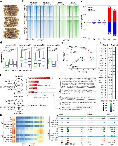 Fig. 4. E2f1 is a repressor of minor ZGA.a Representative bright field images of embryos (stage 23) showing that e2f1 MO embryos display abnormal morphology at early development, which could be partially rescued by co-injecting e2f1 MO and e2f1 mRNA. Scale bar, 200 μm. b Heatmaps of chromatin accessibility detected by CANTAC-seq at stages 7 and 8 upon e2f1 MO, n = 2 biological replicates. c The box plot illustrates the numbers of up- and down-regulated genes upon e2f1 MO at different developmental stages. d The box plot illustrates the expression level of the genes up- or down-regulated upon e2f1 MO in uninjected WT, e2f1 MO, and e2f1 rescue embryos (e2f1 RE) at stages 7 and 8. The results are presented as the median Log2 (TPM + 1), along with the 25th and 75th quartiles, as well as the 5th and 95th percentiles. Statistical significance was determined using a paired two-sided Student’s t-test, n indicates the number of genes in each condition. e Principal component analysis (PCA) of transcriptome profiles (n = 2 biological replicates) of uninjected embryos (WT), e2f1 MO embryos (MO), as well as e2f1 RE at stages 6–8. A developmental trajectory was indicated with a dashed line for the WT embryos. f Overlap between the up-/down-regulated genes upon e2f1 MO at stage 7 and those up-/down-regulated from stage 7 to stage 8 during normal development, and GO enrichment analysis of the overlapped genes. The P values were calculated based on a one-sided hypergeometric test. Whereas no significant GO terms were enriched for down-regulated genes, a set of GO terms for up-regulated genes was enriched, and genes were listed to the right. The enriched GO terms are ranked by –Log10 (adjusted P value). The adjusted P values for enrichment of specific GO terms were calculated by using the linear step-up method of Benjamini and Hochberg. g Heatmaps of TF DNA binding sequence motifs identified from gained proximal and distal CANTAC-seq peaks upon e2f1 MO at stage 7. Motif activity (–Log10