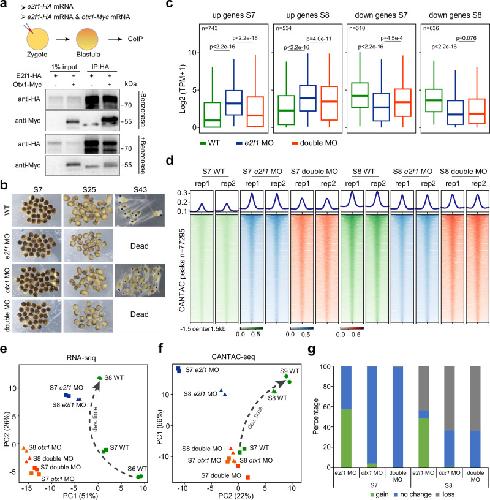 Fig. 5. Otx1, interacting with E2f1, acts as an activator.a Co-immunoprecipitation (IP) was carried out using the antibody against HA, followed by WB to detect HA-tagged E2f1 or Myc-tagged Otx1 using anti-HA or anti-Myc antibody, respectively, in embryos expressing both HA-tagged E2f1 and Myc-tagged Otx1. Embryos expressing only HA-tagged E2f1 were used as a negative control. Protein lysates were treated with or without benzonase nuclease. Input lanes represent 1% of the total protein lysate. Three independent experiments were performed, and similar results were obtained. b Representative bright field images of uninjected WT embryos, e2f1 MO embryos, otx1 MO embryos, as well as e2f1 and otx1 double MO embryos at stages 7, 25, and 43. Scale bar, 500 μm. c The box plot illustrates the expression of the genes up- or down-regulated upon e2f1 MO at stage 7 and 8 in uninjected WT, e2f1 MO, as well as e2f1 and otx1 double MO embryos. The results are presented as the median Log2 (TPM + 1), along with the 25th and 75th quartiles, as well as the 5th and 95th percentiles. Statistical significance was determined using a paired two-sided Student’s t-test, n indicates the number of genes in each condition. d Heatmaps of chromatin accessibility detected by CANTAC-seq at stage 7 and 8 upon e2f1 MO or e2f1 and otx1 double MO, n = 2 biological replicates. e PCA of transcriptome profiles (n = 2 biological replicates) of uninjected WT embryos, e2f1 MO embryos, otx1 MO embryos, as well as e2f1 and otx1 double MO embryos at stages 7 and 8. A developmental trajectory was indicated with a dashed line for the WT embryos. f PCA of chromatin accessibility profiles (n = 2 biological replicates) of uninjected WT embryos, e2f1 MO embryos, otx1 MO embryos, as well as e2f1 and otx1 double MO embryos at stages 7 and 8. A developmental trajectory was indicated with a dashed line for the WT embryos. g The bar plot illustrates the percentage of genes (n = 699) induced between stage 7 and 8 that gain, lose, or do not change chromatin accessibility upon e2f1 MO, otx1 MO, as well as double MO at stage 7 and stage 8. Genic region: from 10 kb upstream of the Transcription Start Site to 10 kb downstream of the Transcription End Site. Source data are provided in the Source Data file. |