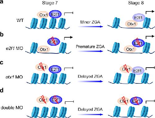 Fig. 7. Model of coordinated regulation of zygotic gene expression by E2f1 and Otx1.The model illustrates how E2f1 and Otx1 co-regulate the transcription of a subset of zygotic genes before the MBT in X. tropicalis. Here, E2f1 functions as a repressor (brake), suppressing zygotic gene expression, while Otx1 acts as an activator (accelerator), promoting zygotic gene transcription. The repressive effect of E2f1 is dominant, and the effect of Otx1 on transcriptional activation becomes evident only in the absence of E2f1. In WT embryos, E2f1’s repression persists until stage 7 but diminishes at stage 8, allowing Otx1 to activate transcription (a). E2f1 knockdown causes premature zygotic gene transcription at stage 7 (b), while Otx1 knockdown prevents activation at stages 7 and 8 regardless of E2f1 status (c, d). |