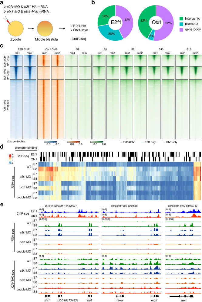 Fig. 6. E2f1 and Otx1 co-modulate minor ZGA.a A schematic view of the workflow of E2f1 and Otx1 ChIP-seq experiments. b Distribution of E2f1 and Otx1 binding sites at the promoter, gene body, and intergenic region. c Heatmaps of normalized read density of ChIP-seq (n = 2 biological replicates) for E2f1 and Otx1, as well as CANTAC-seq at five developmental stages. ChIP-peaks were categorized into three subgroups: E2f1-bound peaks (E2f1 only, n = 12,031), common peaks bound by E2f1 and Otx1 (E2f1&Otx1, n = 10,439), and Otx1-bound peaks (Otx1 only, n = 55,395). d Integrative heatmaps depicting the expression of E2f1 and Otx1 co-regulated genes (n = 220) in uninjected WT, e2f1 MO, otx1 MO, and double MO embryos at stages 7 and 8. Genes with E2f1 or Otx1 ChIP-peaks at promoter regions are marked in black. e Genome browser view of ChIP-seq, RNA-seq, and CANTAC-seq normalized read counts at sia1/2, mixer and mix1, and gsc loci. |