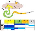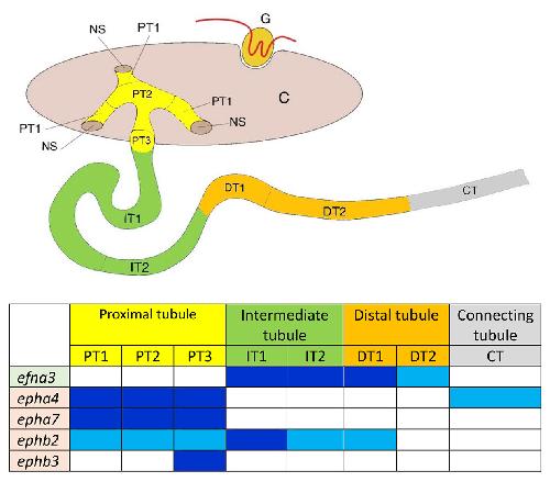 Schematic representation of the pronephros and table (inspired by Raciti el al., 2008); Ephrin ligands are outlined in green and Eph receptors in light orange. Dark blue: strong expression. Turquoise blue: middle expression. Efnb2 expression is detected in the glomus at stage 35/36 and not in the tubule and is therefore not included in the table. |