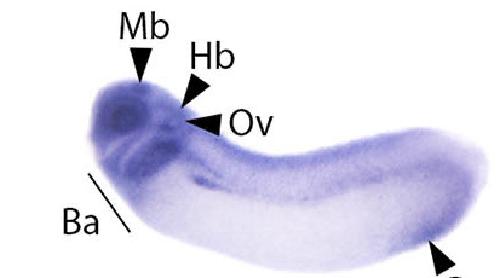 WISH analysis at stages ranging from early neurula stage 14 (appearance of the kidney field) to early tadpole stage 35/36 (functional pronephros). Anterior, dorsal and lateral views are shown at neurula stages (st14 and 20). Lateral and dorsal views are shown at tailbud stage 25. Only lateral views are shown for tailbud stages 28 and 32, and early tadpole (st35/36). At stage 14, 20 and 25, images of sectioned embryos are shown with red dotted lines, indicating the corresponding levels on whole mounts. For convenience, these levels are just indicated with arrows 1, 2, and 3 at stage 28, 32 and 35/36 (note that the sections were not made from the whole mount specimen shown). Efna3 starts to be detected in the developing tubule from the stage 28. It is detected prior to stage 28 in the developing nervous system and migrating cephalic neural crest cells. Efna3 is expressed at stage 14 in the primary neuronal precursors (Np), and weakly in the anterior neural folds (Nf). Neural expression expands at st20 to the closing neural tube (Nt). It is strong in the emerging first (n1) and third/fourth (n3, n4) branchial arches neural crest streams. Cg: cement gland. At stage 25, efna3 expression is strong in branchial neural crest streams populating the first arch around the eye rudiment (n1), as well as the third and fourth arches (n3, n4). It is also detected in the dorsal neural tube (Nt). Efna3 is also expressed in the proctodeal region (Pr). At stage 28, efna3 is now expressed in the ventral region of the pronephric anlage (red arrowhead). It is detected in the dorsal region of the midbrain (Mb) and in the hindbrain (Hb), as well as in the developing branchial arches (Ba). In addition to the first branchial arch around the eye (n1), and the third and fourth branchial arches (n3, n4), efna3 is now also detected in the second branchial arch (n2). Expression of efna3 is observed in developing neural placodes, in the epidermis overlying the optic vesicle that contains the lens placode (Lp), in the ventral region of the otic vesicle (Ov) and in the developing posterior lateral line placode (Pp, blue arrowhead). Efna3 is also detected in the proctodeal region (Pr). Pronephric expression at stage 32 is very strong in a region of the tubule at the origin of the intermediate and distal segments (red arrowhead). Efna3 continues to be detected in the anterior midbrain (Mb) and in a hindbrain (Hb) region likely corresponding to rhombomere 4. It continues to be detected in the four branchial arches (n1, n2, n3 and n4), in the posterior lateral line placode and in the otic vesicle (Ov). It is now expressed in the developing lens (L). Expression at stage 35/36 is similar to stage 32 in the intermediate and distal segments of the developing tubule (It, Dt). Expression is diminishing in the branchial arches (Ba) and the hindbrain (Hb) but is very strong in dorsal midbrain (Mb), otic vesicle (Ov), and lens (L). Scale bar: 1.7 mm for whole embryo, 0.5 mm for embryonic magnification and 280 μm for section. |